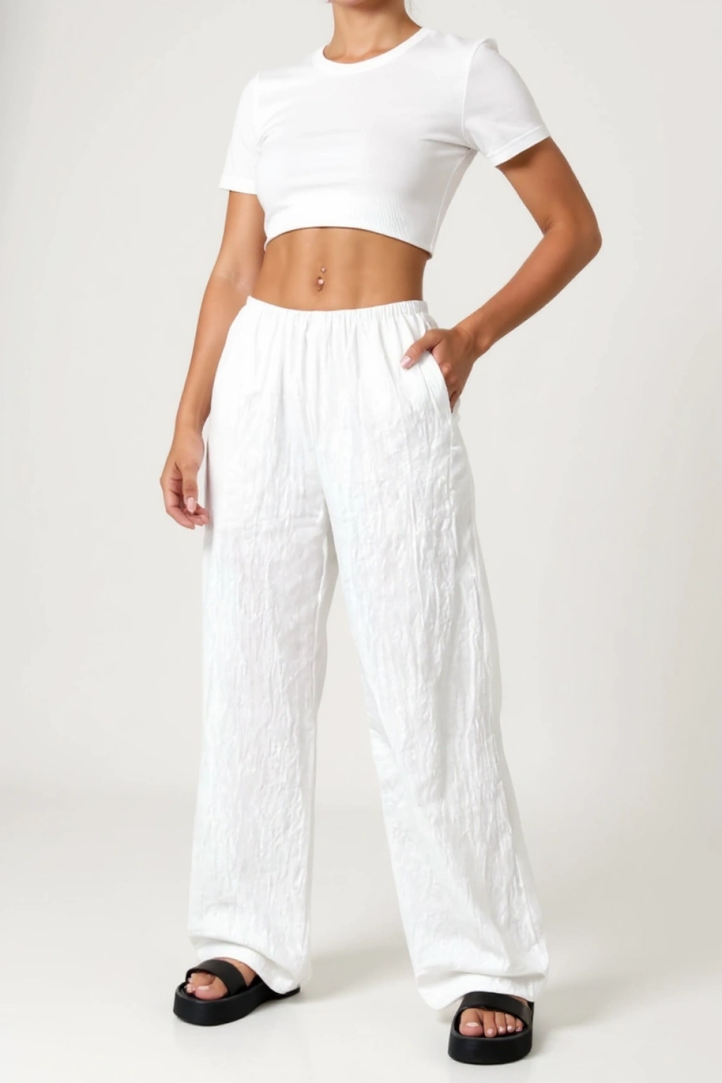 Kadın Beyaz Bol Kesim Cepli Geniş Paça Dökümlü Pantolon – Modern ve Şık Tasarım