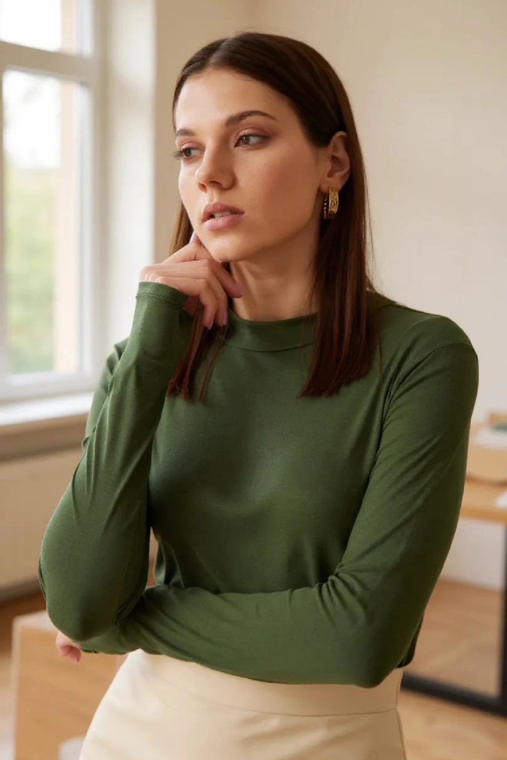 • Ofis Stili: Krem rengi blazer altına giyilerek sofistike kombin