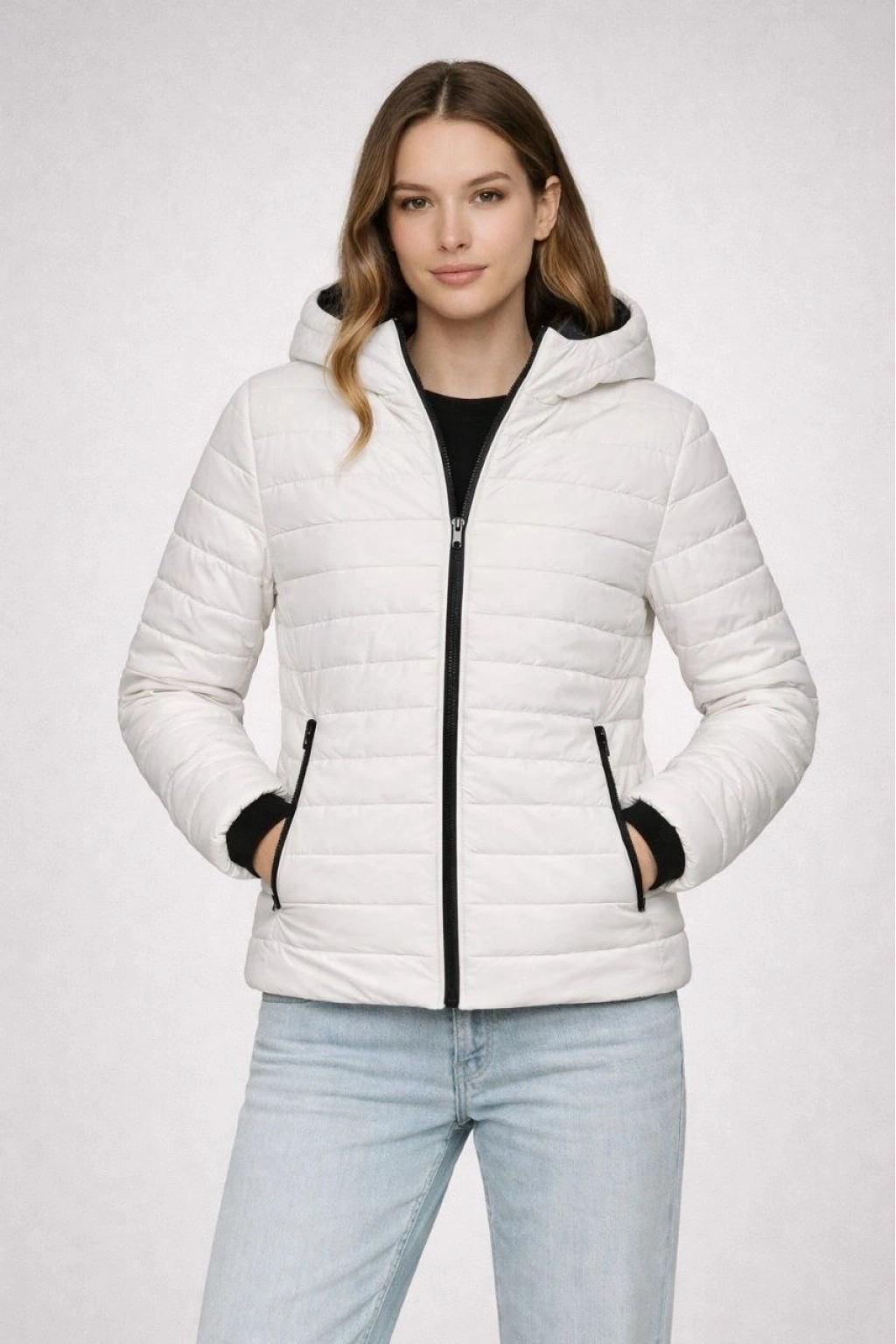 Kadın Şişme Kapüşonlu Fermuarlı Mont Su itici Kapitone Astarlı Kumaş Cepli Kışlık Rahat Kalıp - Krem