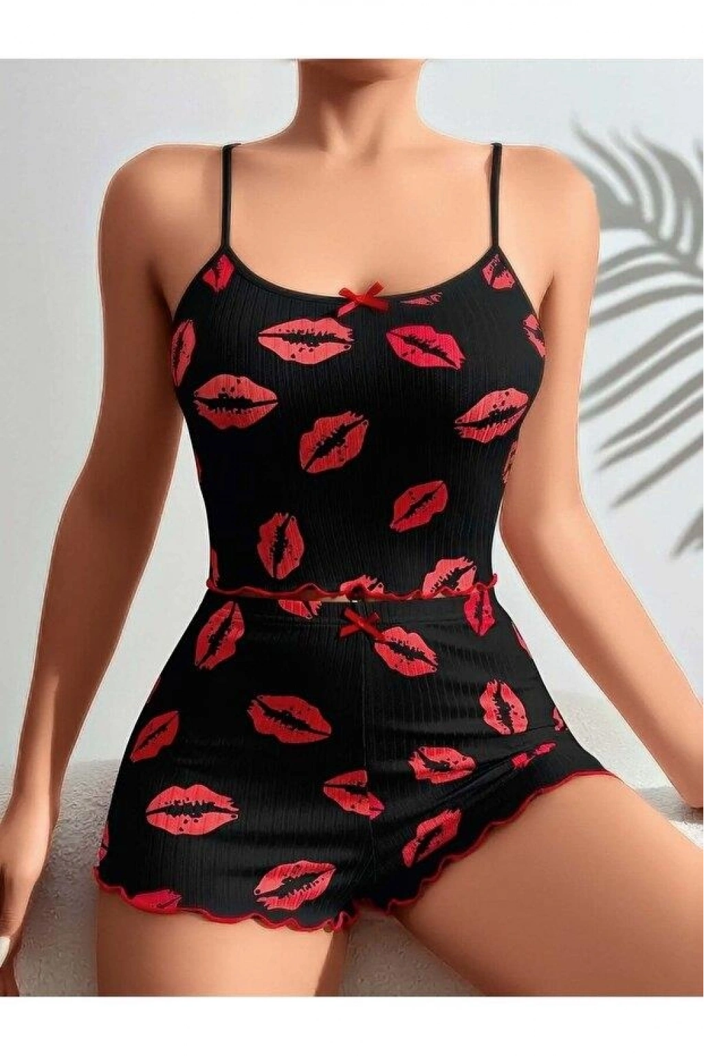 Kadın Siyah Dudak Desenli şortlu gecelik pijama takımı, cesur ve şık bir görünüm yaratır. Yumuşak kumaşı sayesinde rahat kullanım imkanı sunar.