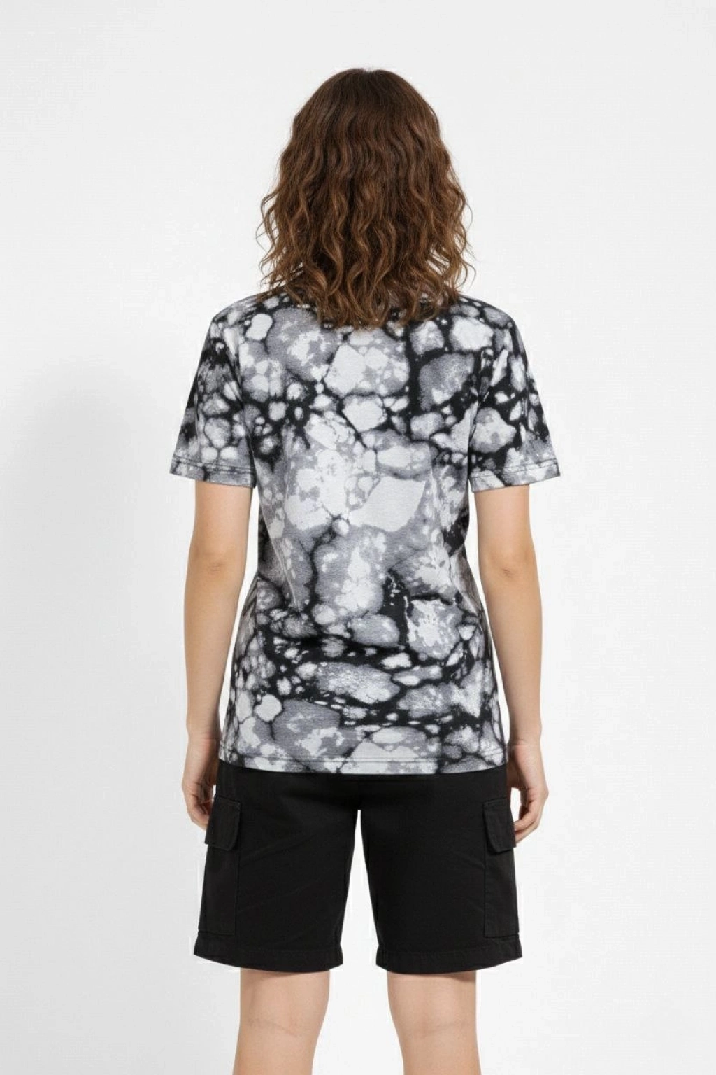 Kadın Siyah Gri Taş Desenli Tişört – Regular kalıp, Bisiklet Yaka, Dijital Baskılı Modern Tasarım T-Shirt - Siyah