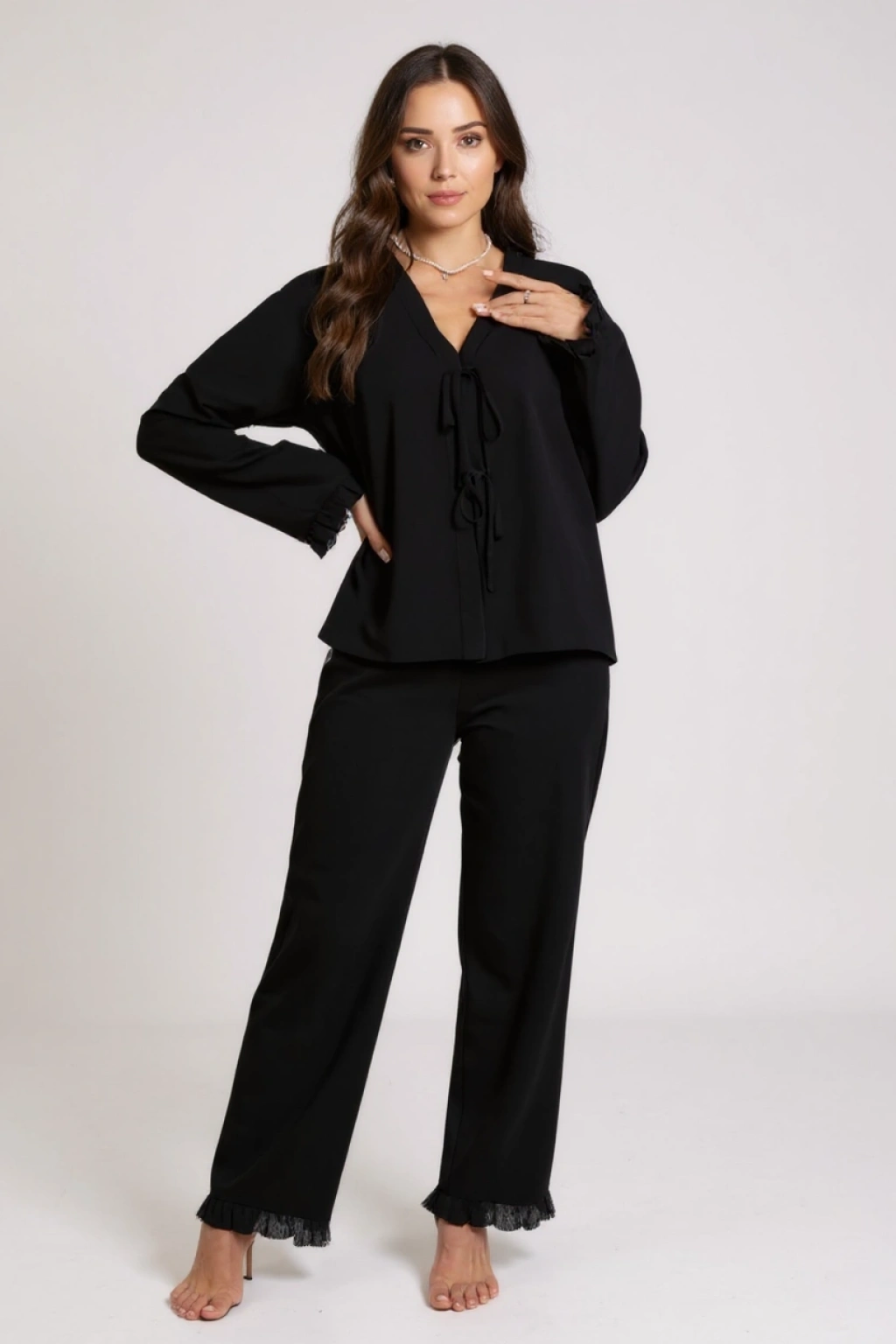 Kadın Siyah Önden Bağlamalı Kolu ve Paçası Fırfır Detaylı Uzun Kollu Pijama Takımı