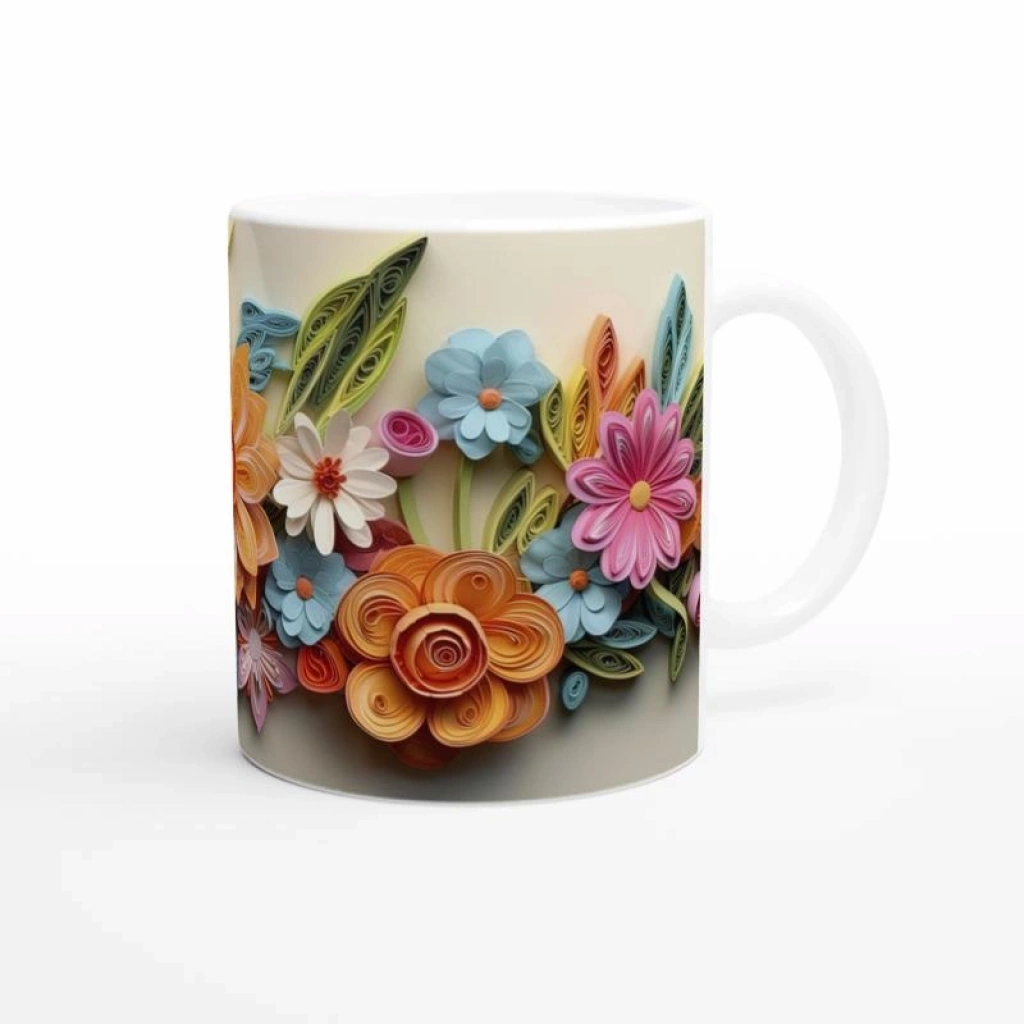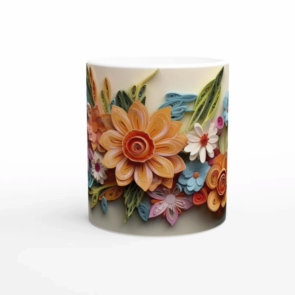 Kağıt Sanatı Çiçekli Kupa Bardak, canlı turuncu, pembe ve mavi çiçek tonlarıyla bahar enerjisini sofranıza taşıyor.