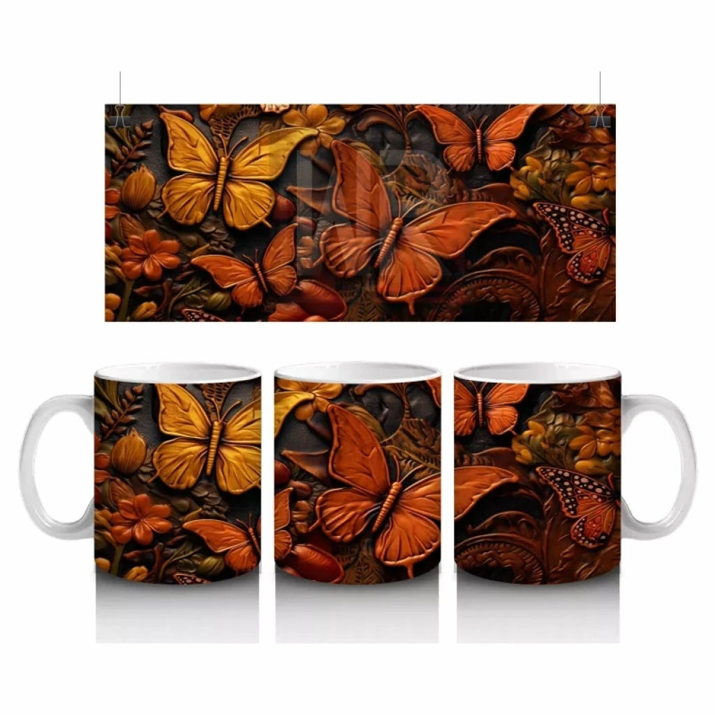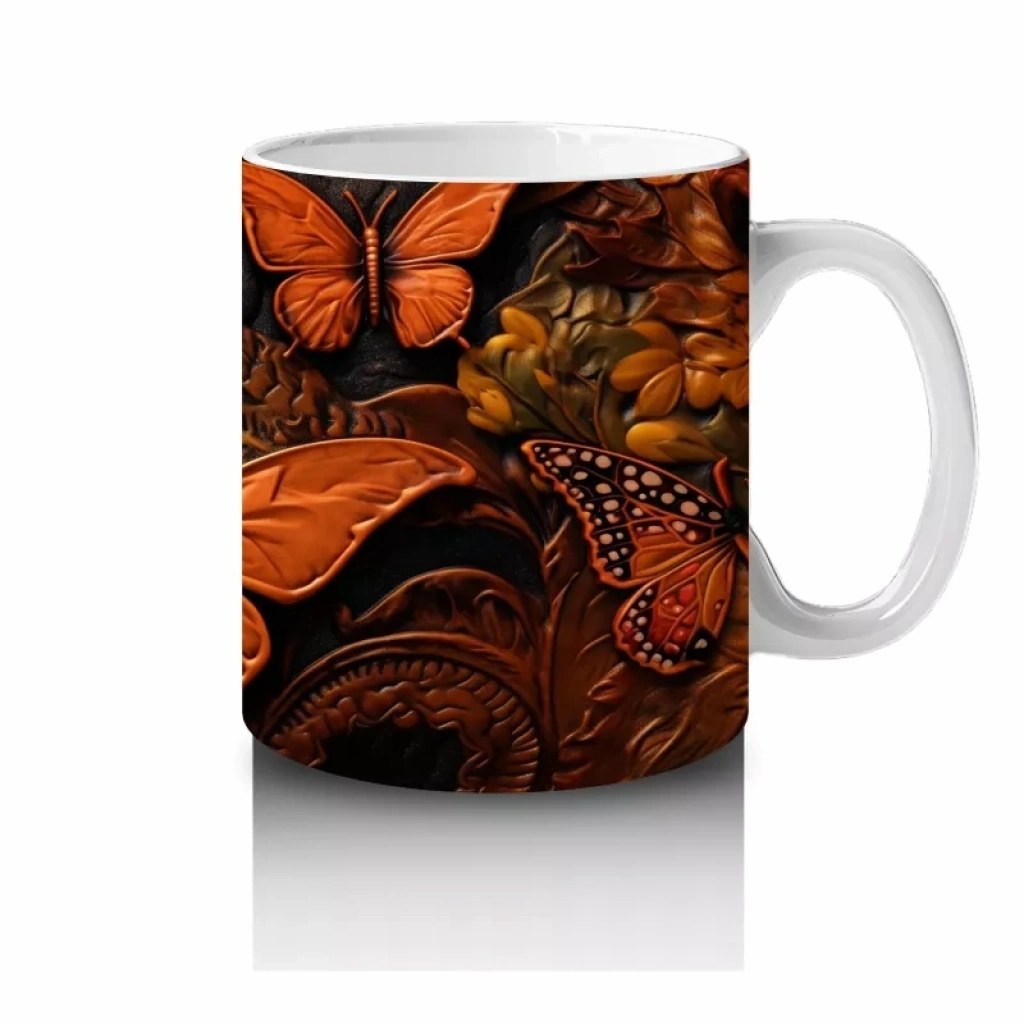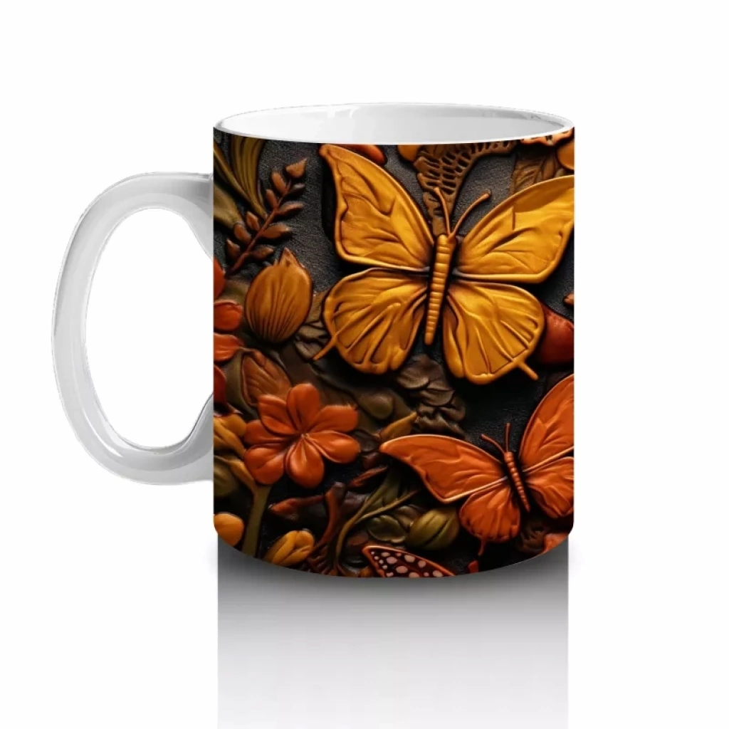 Toprak tonlarındaki rölyef kelebekler, doğallığın ve zarafetin dengeli birleşimini yansıtıyor. Sıcak renk paletiyle her ortama uyum sağlayan, dekoratif bir kupa alternatifi.