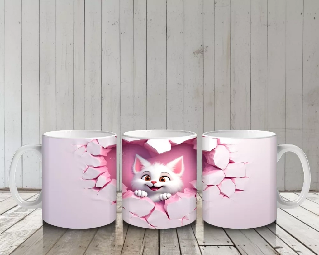 Kalp şeklindeki çatlağın içinden bakan bu minik kedicik, sevimliliğiyle gönülleri fethediyor. Romantik ve şirin detaylarla dolu bu kupa, kedi severler için harika bir hediye seçeneği.