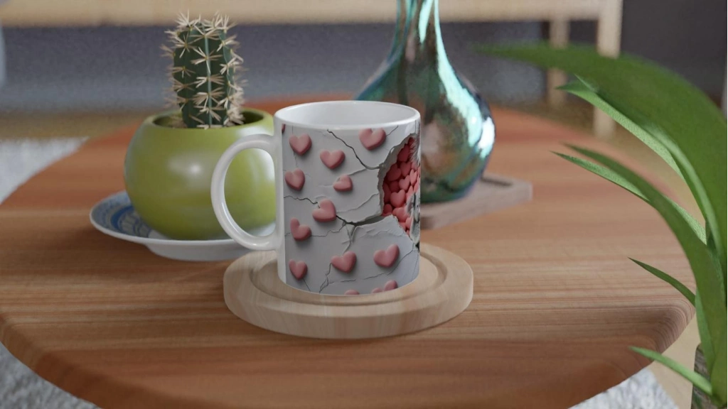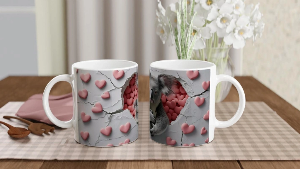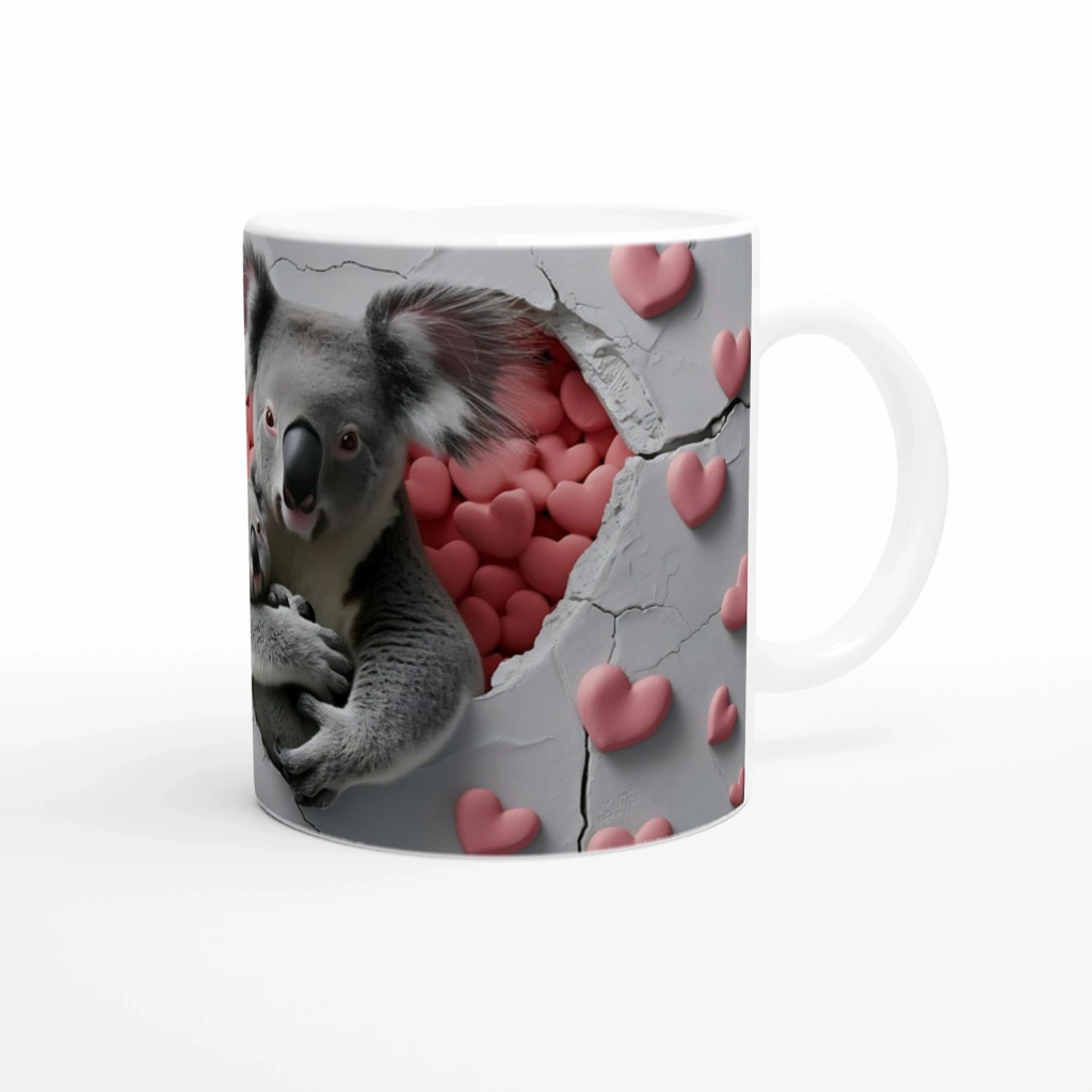 Kalp şeklindeki kırık duvarın ardından uzanan sevimli koala ve yavrusu, pembe kalp yastıklarla dolu arka planla birleşerek sevginin en masum halini yansıtıyor. Duygusal ve doğa dostu hediyelik arayanlar için ideal bir tercih.