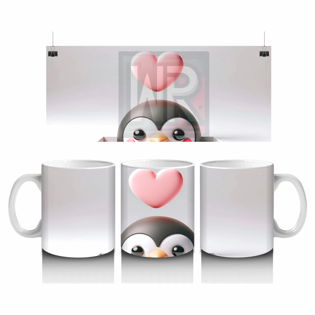Kalp Figürlü Arka Plan Üzerinde Sevimli Penguen Yüzü – Baskılı Kahve Kupası
