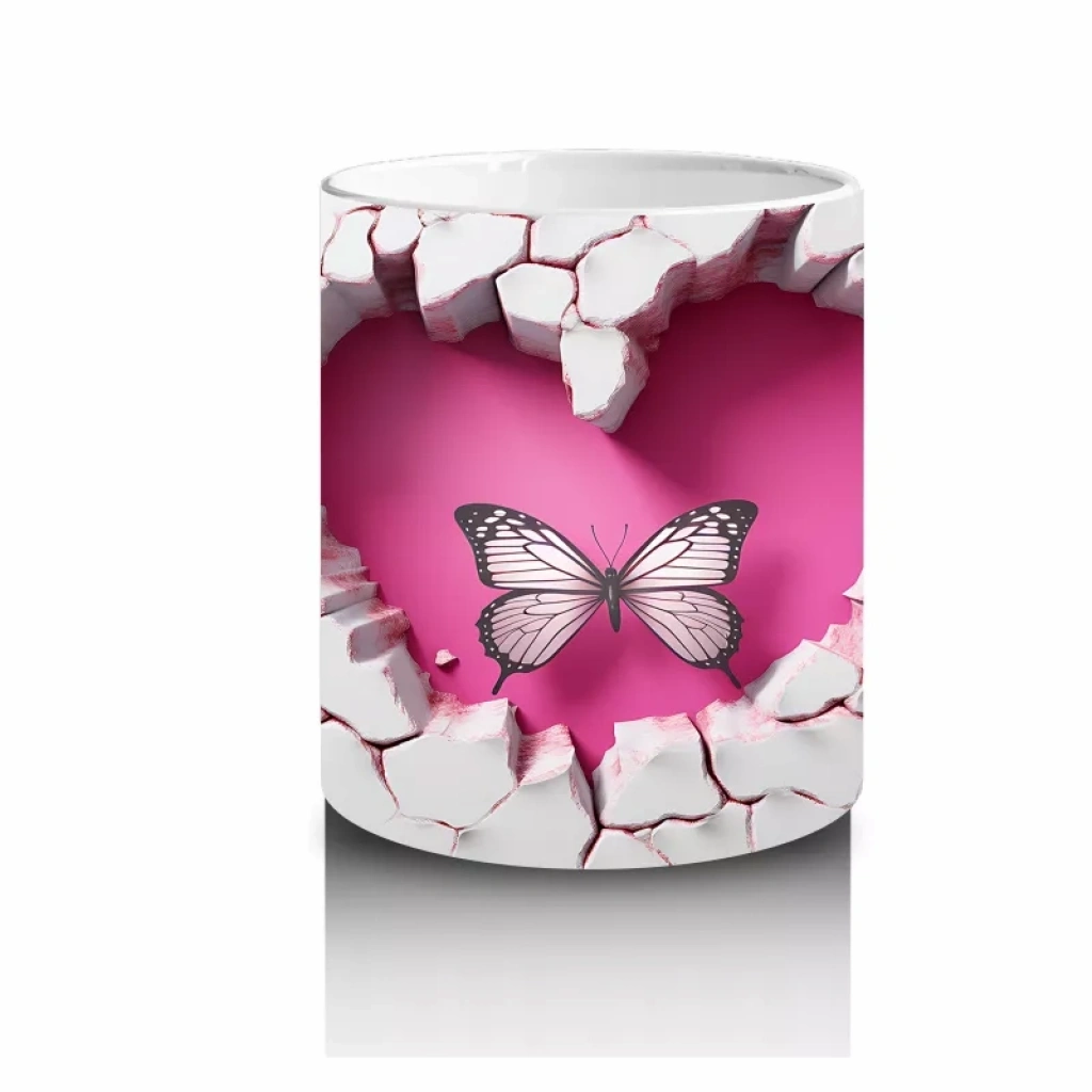 İki pembe kelebeğin kalp şeklindeki çatlakta özgürce uçuşu, sevgi ve uyumu simgeliyor. Romantik tasarımları sevenler için anlamlı ve görsel açıdan etkileyici bir kupa alternatifi.