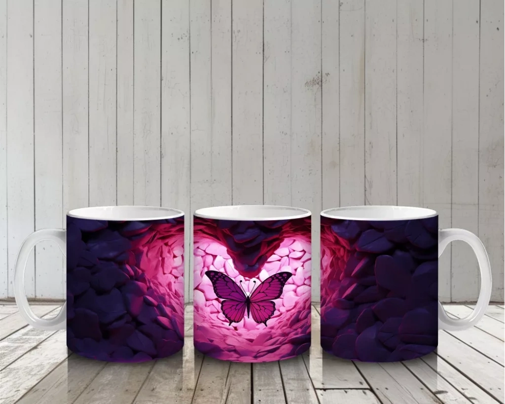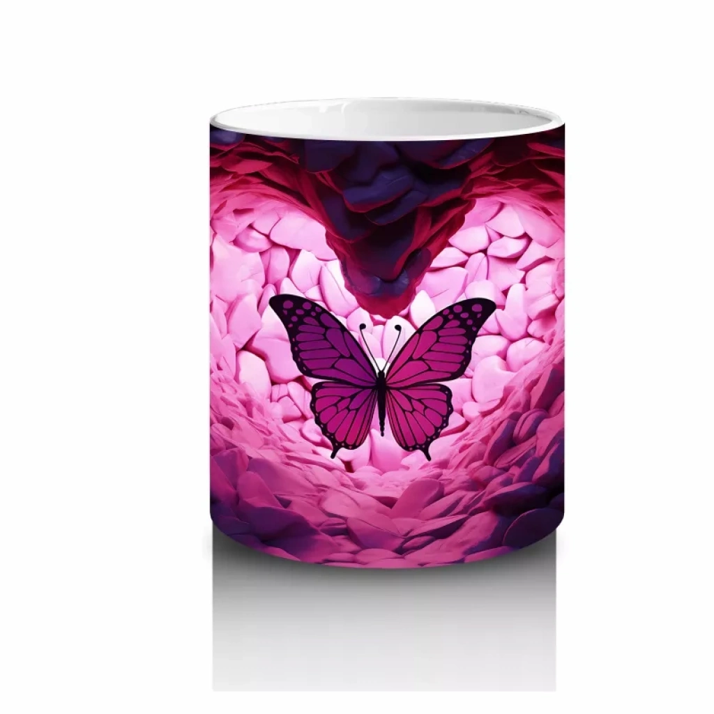 Kalp Şeklinde Işıltılı Taşlar Arasında Kelebek – Baskılı Kahve Kupası