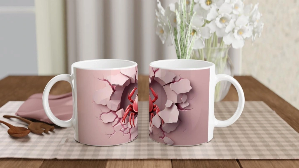 Pembe tonlardaki kalp şeklinde çatlamış duvarın ortasında beliriveren sevimli kırmızı yengeç, hem deniz tutkunlarına hem de hayvanseverlere hitap ediyor. Renkli ve özgün yapısıyla günlük kullanım için ideal.