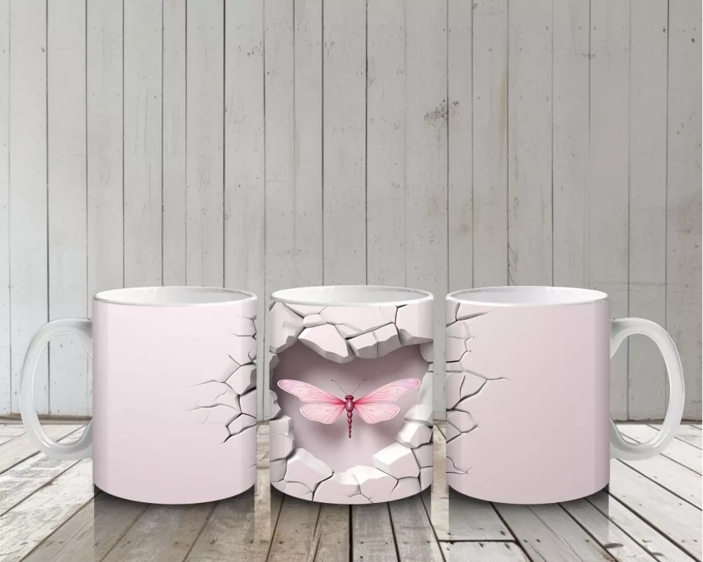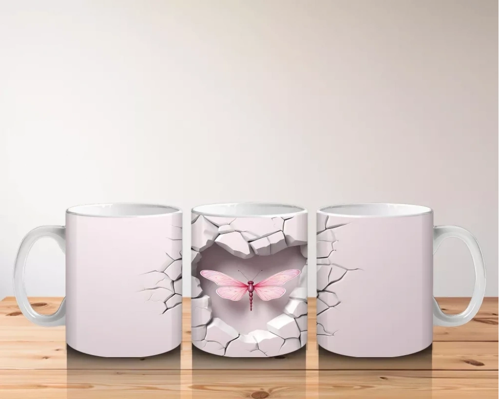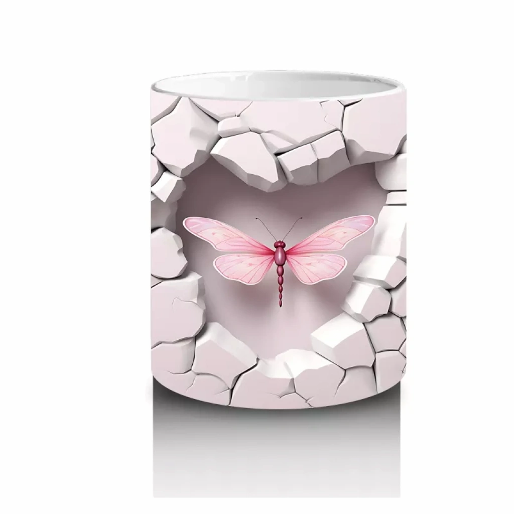 Kalp formundaki çatlak içinde belirginleşen pembe yusufçuk silueti, romantik ve minimal bir etki sunuyor. İnce detayları sevenler için anlamlı ve zarif bir kupa tasarımı.
