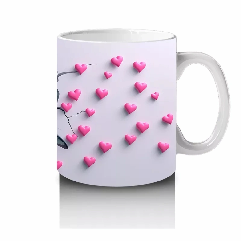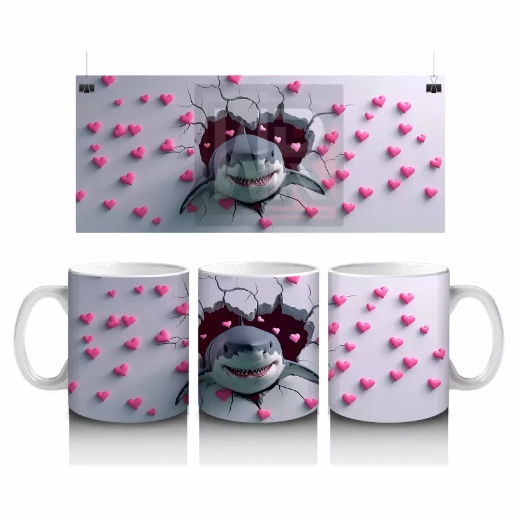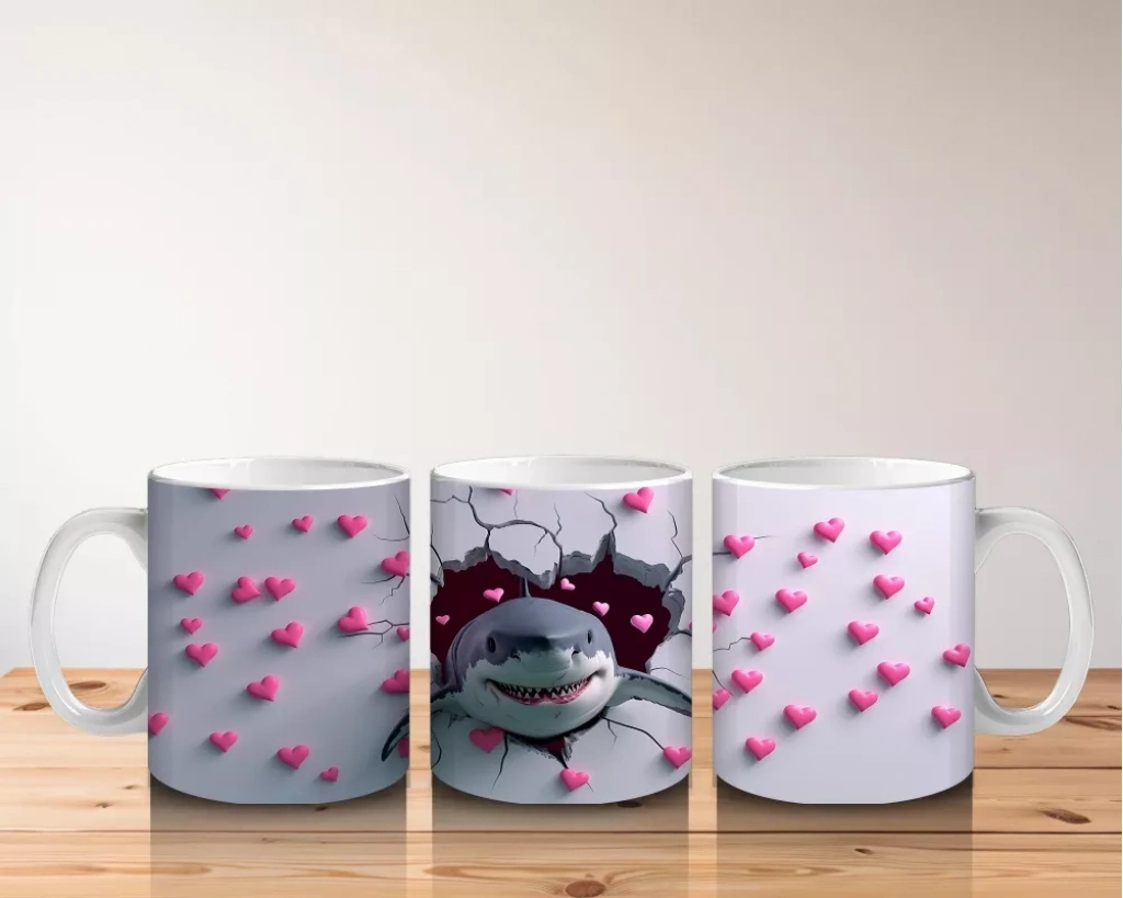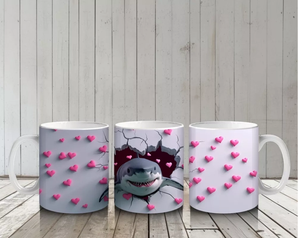 Kalplerle Çevrili Çatlak Zeminden Fırlayan Gülümseyen Köpekbalığı – Baskılı Kahve Kupası