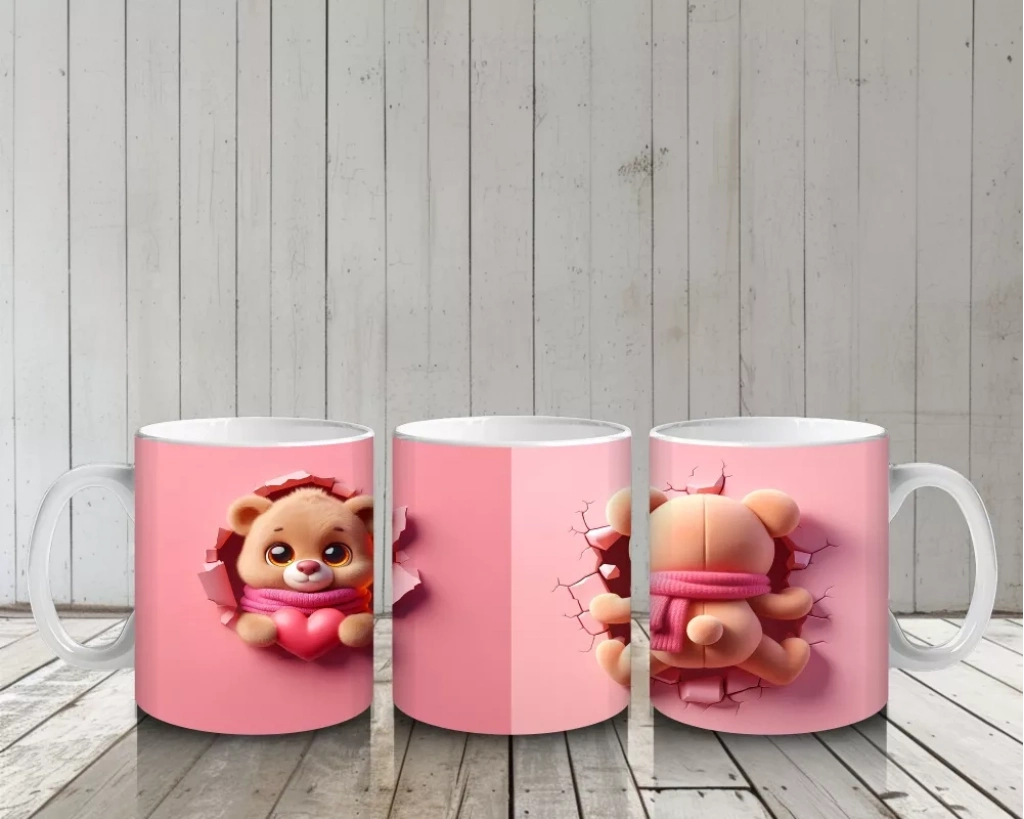 Yandan ve arkadan detaylandırılmış kalpli ayıcık figürü, tasarımın her yönünü sevgiyle buluşturuyor. Hem dekoratif hem duygusal dokunuşlar taşıyan özel bir kupa seçimi.