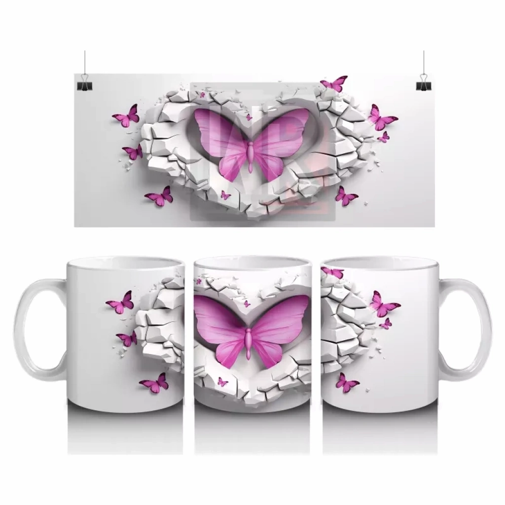 Kalp Şeklinde Duvar Kırığında Pembe Tema Kelebek – Baskılı Kahve Kupası