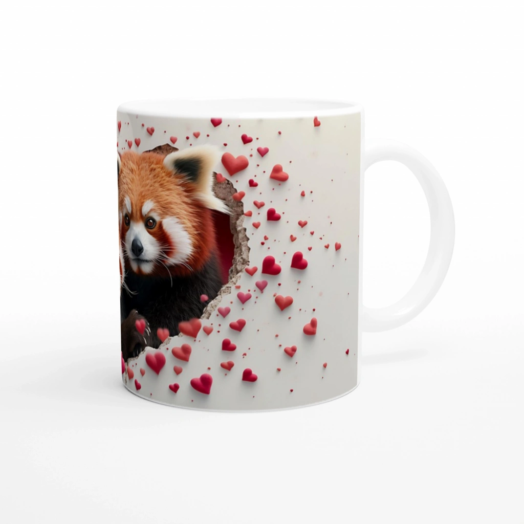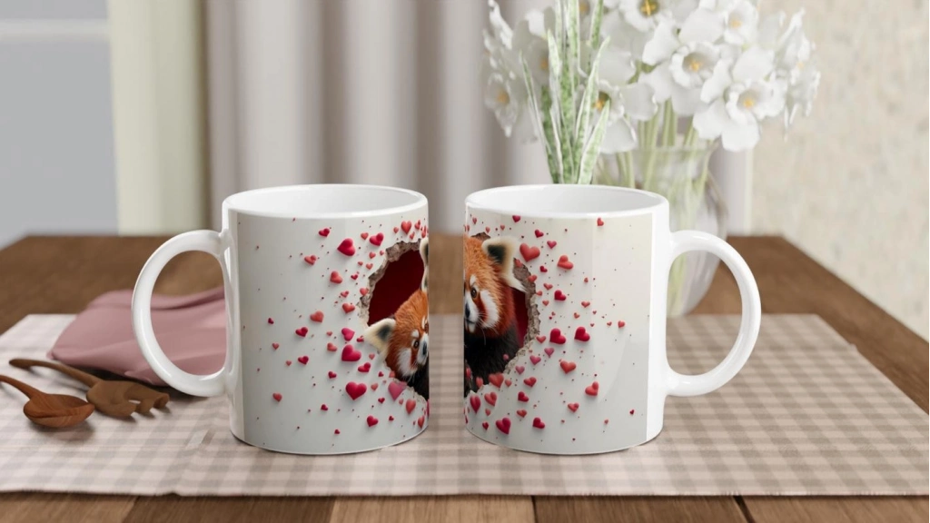 Kalp şeklinde kırılmış duvarın ardında birbirine sarılmış iki kızıl panda, sevgi dolu bir dünyaya davet ediyor. Derin bakışlar, kırmızı kalp figürleriyle bezenmiş arka planla birleşerek bu kupayı hem anlamlı hem de estetik bir objeye dönüştürüyor.