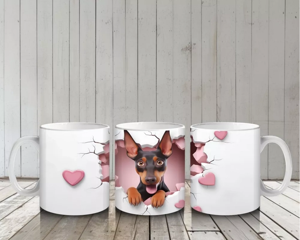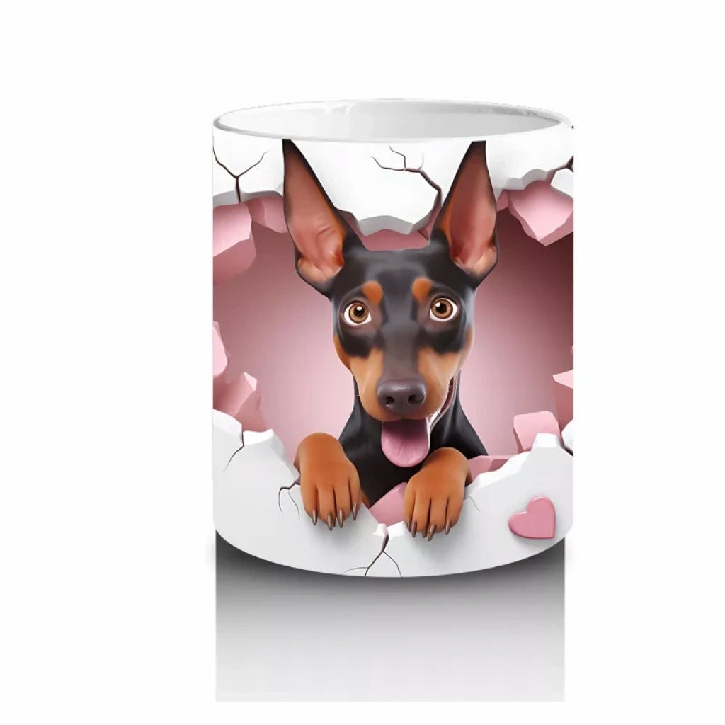 Kalpli fonda yer alan sevimli Doberman, güçlü ve şirin bir duruş sergiliyor. Sıcaklık ve karakteri bir arada sunan özgün bir kupa tasarımı.