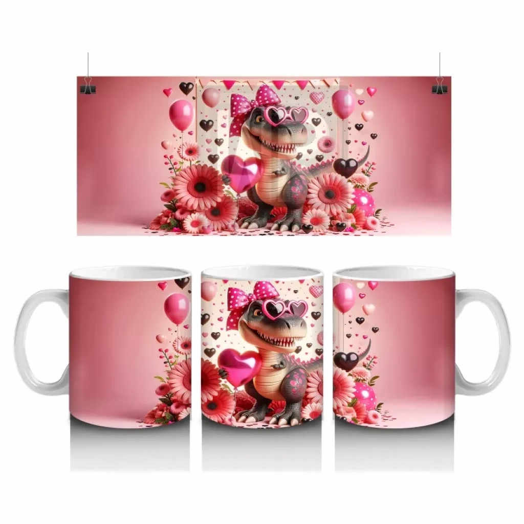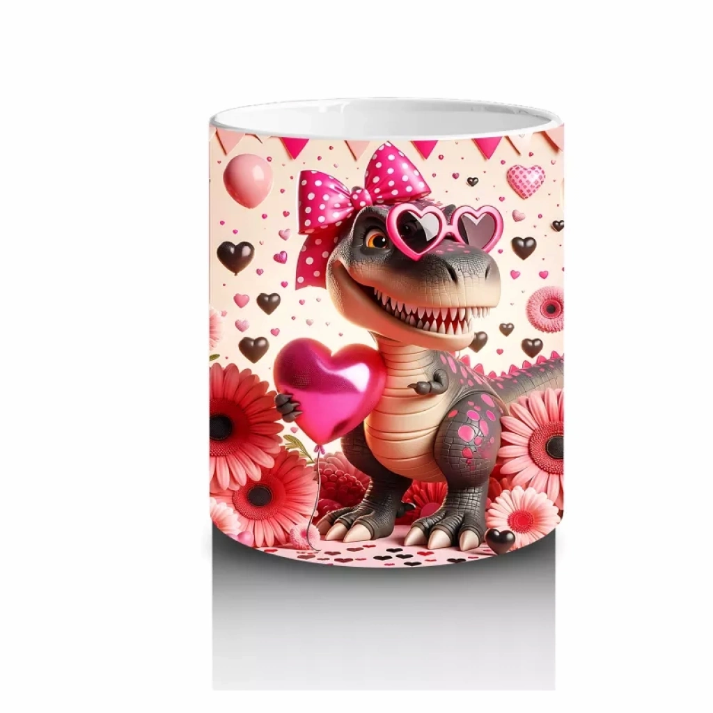 Kalpli gözlük takan dinozor figürü, çiçekler arasında neşeli ve özgün bir tasarım sunuyor. Eğlenceli ve sıcak detayları sevenler için özel bir kupa alternatifi.
