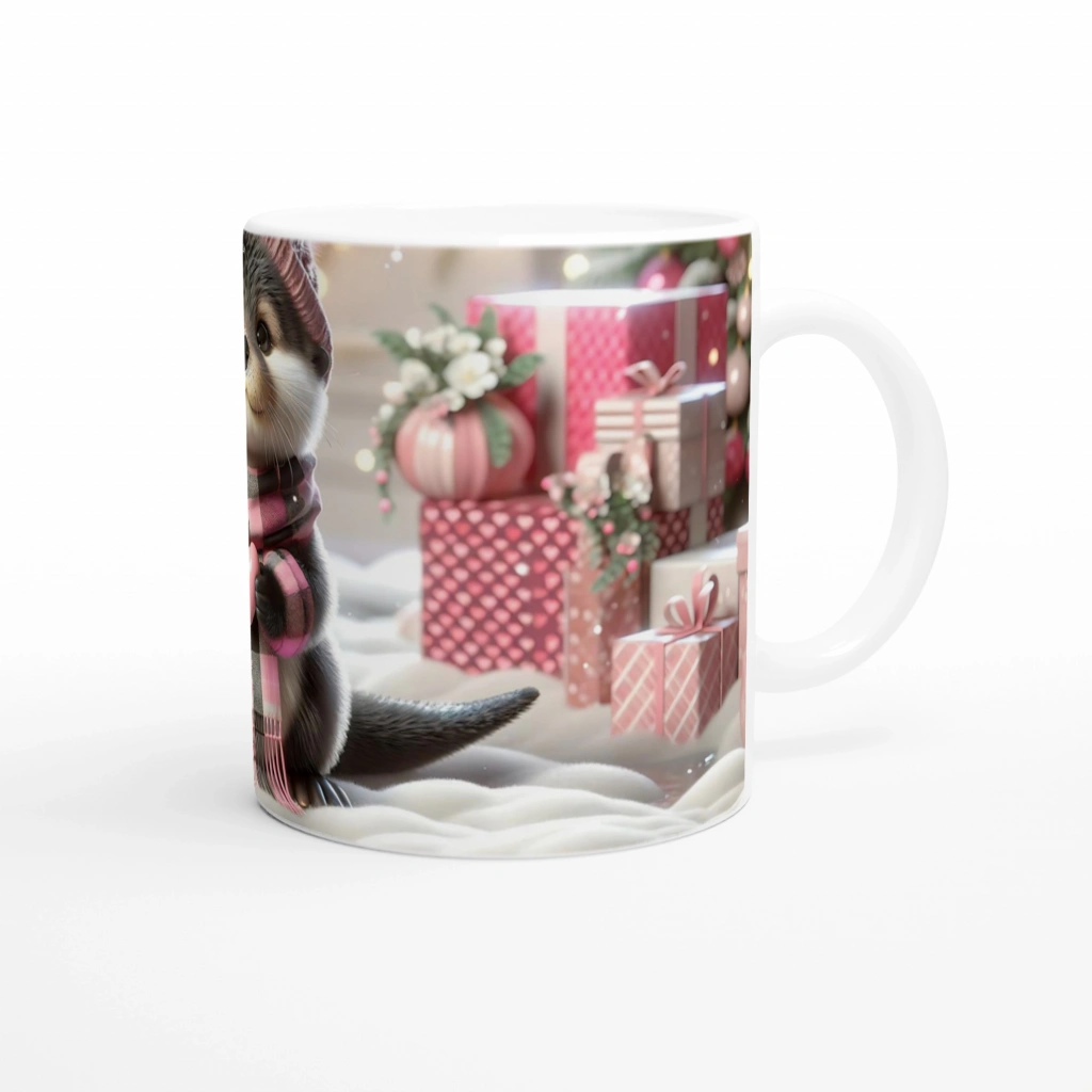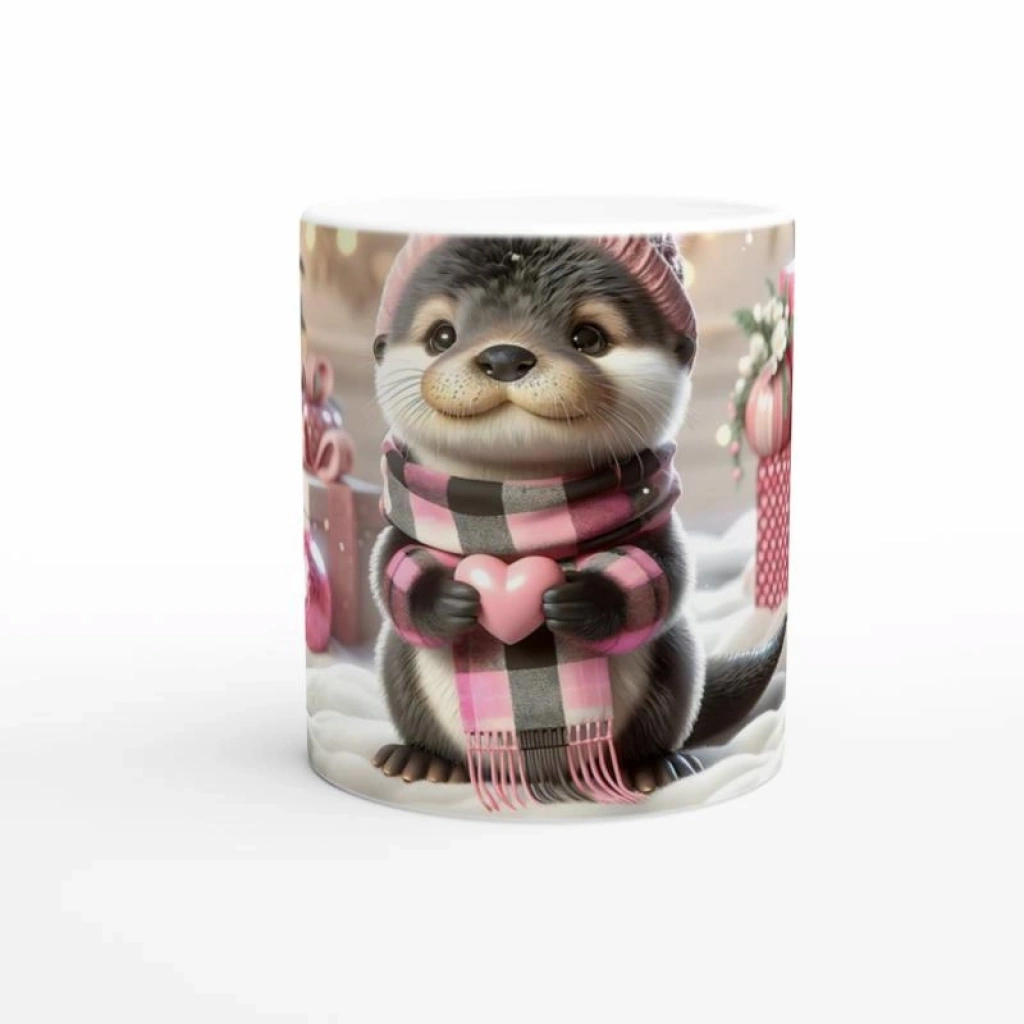 Kalpli Kışlık Şapkalı Su Samuru Temalı Baskılı Kupa Bardak, pembe armağanlarla süslenmiş arka plan, kar taneleriyle bezeli bir atmosfer ve kalp tutan sevimli samur figürüyle yılbaşı ruhunu yansıtır. Neşeli, duygusal ve unutulmaz bir hediye alternatifi sunar.