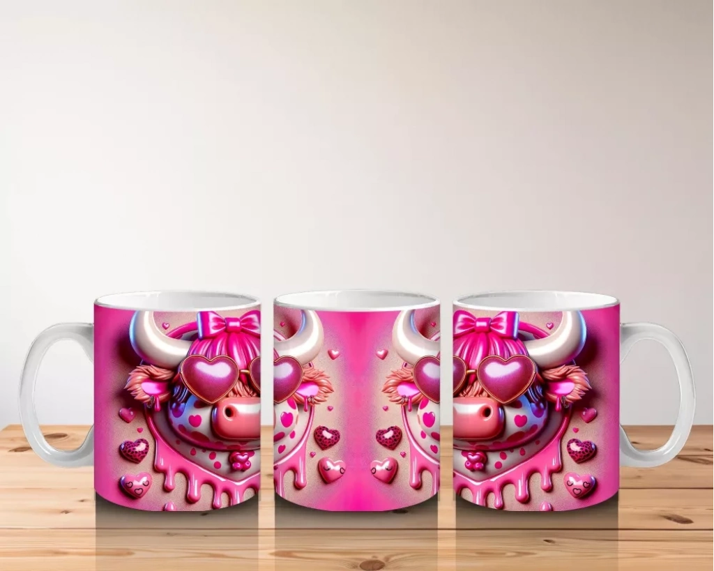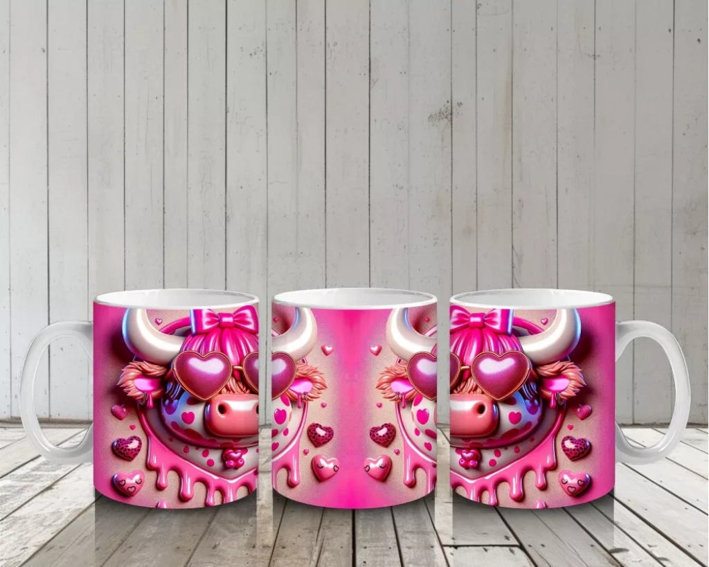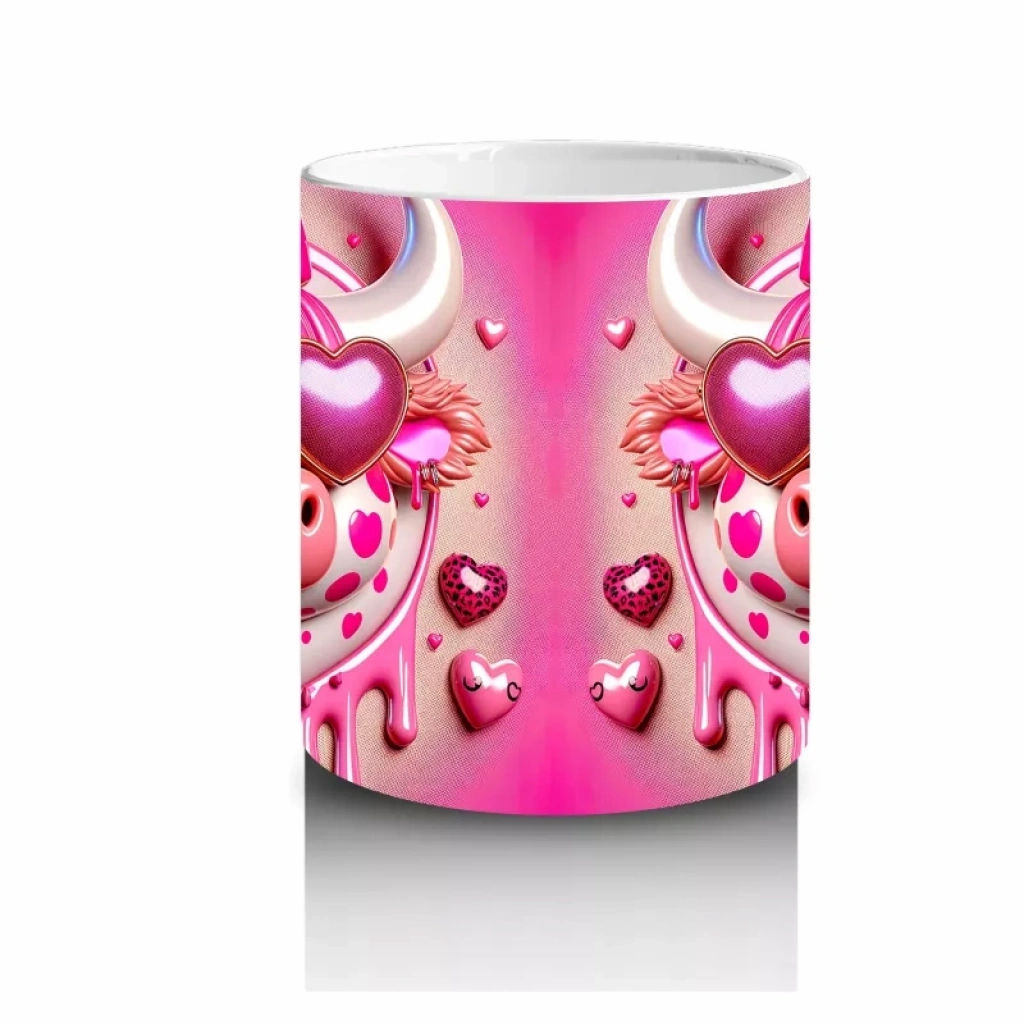 Kalpli zemin üzerinde duran pembe boğa çifti, sevgi ve romantizmi yansıtıyor. Tatlı ve içten tasarımlar arayanlar için özel bir kupa.