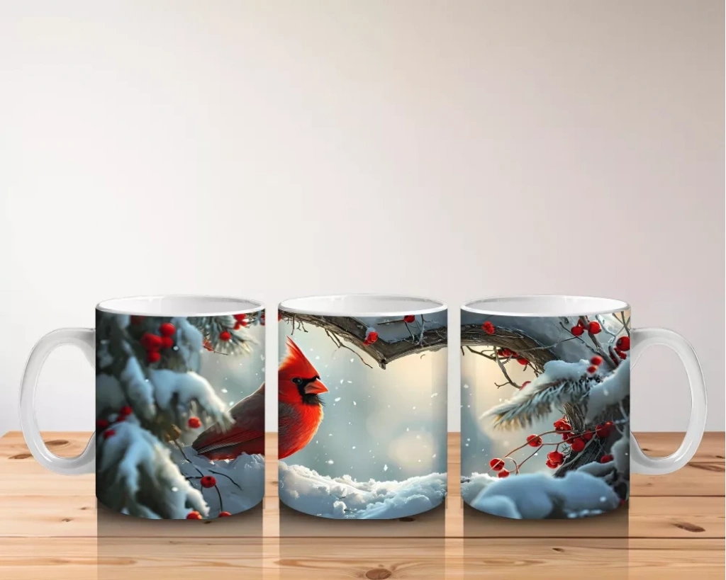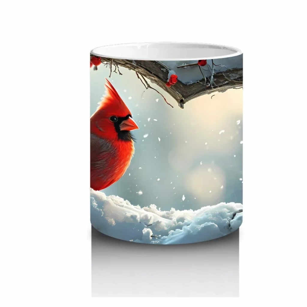 Beyaz kış manzarasında öne çıkan kırmızı kardinal kuşu, sıcak içeceklerinize nostaljik ve estetik bir hava katıyor. Kışa özel bu tasarımla ruhunuzu ısıtın.