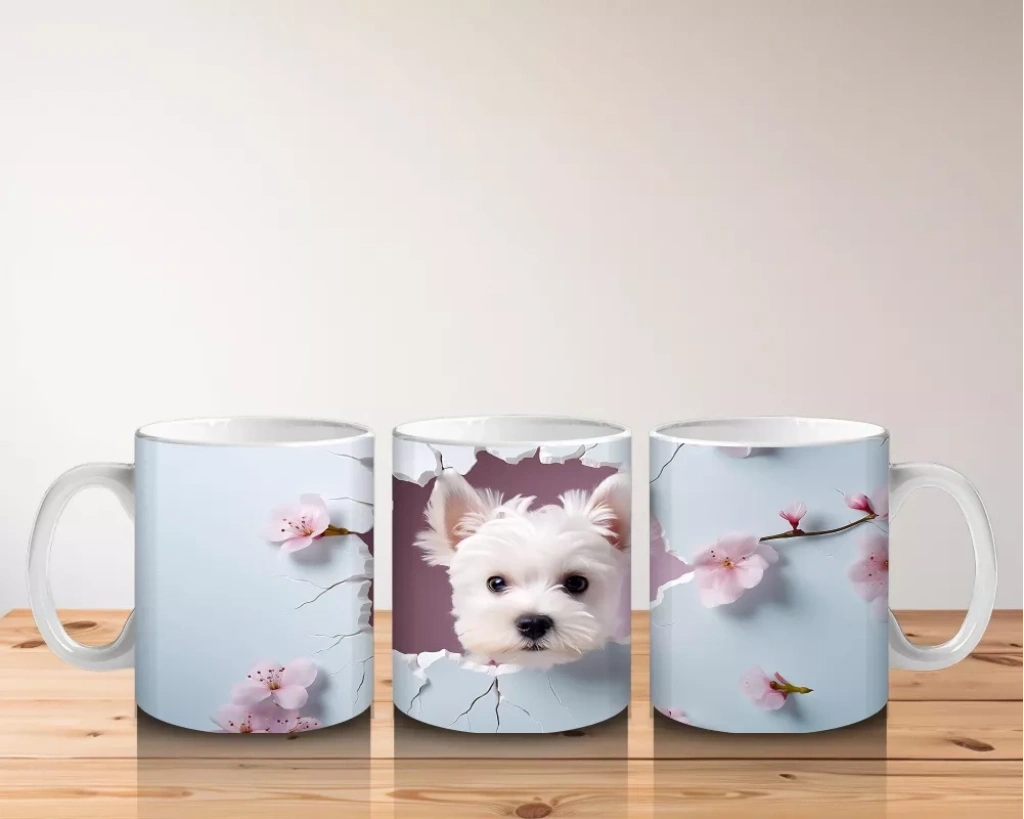 Kiraz Çiçekleri Arasında Neşeli Beyaz Yavru Köpek – Baskılı Kupa