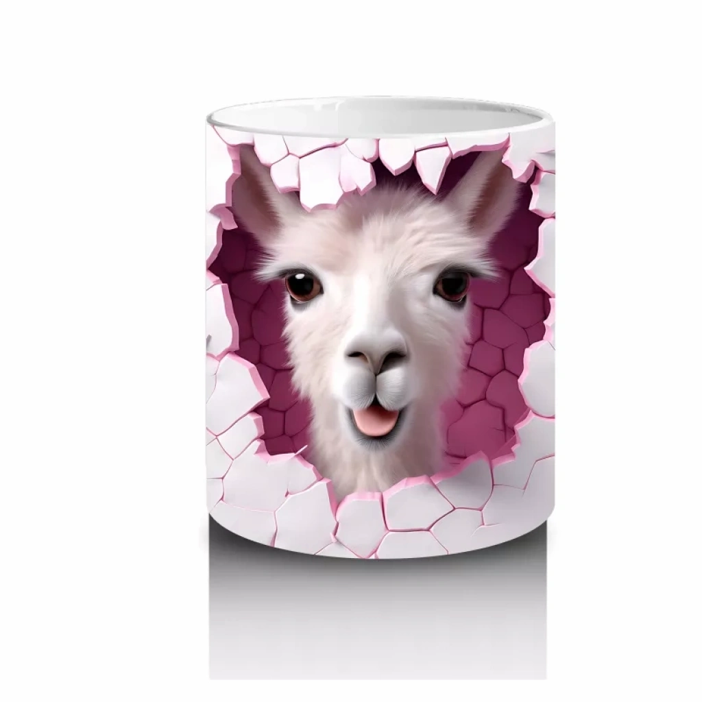 Kırık duvar arasında meraklı gözlerle bakan sevimli lama yavrusu, samimi ve doğal bir hava yayıyor. Sevimli ve huzur dolu tasarımlar arayanlara hitap ediyor.