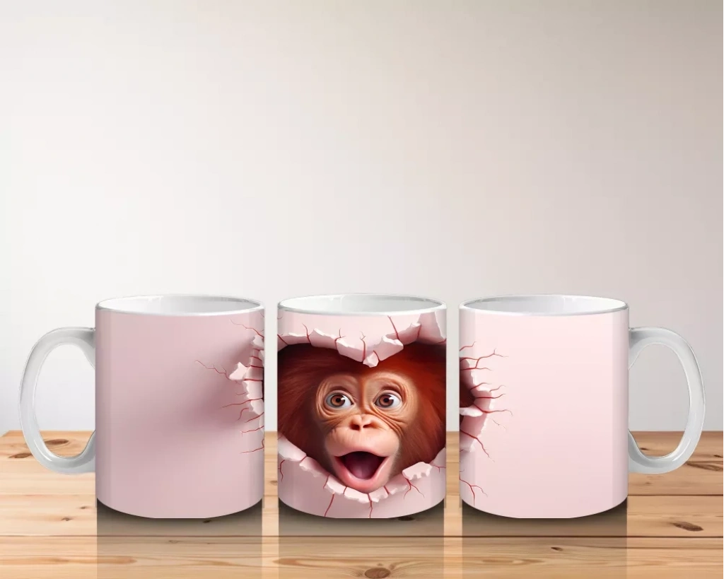 Kırık duvar arasından bizi izleyen maymun figürü, neşeli ve samimi bir atmosfer yaratıyor. Eğlenceli ve sıcak tasarımlar arayanlar için ideal bir kupa.