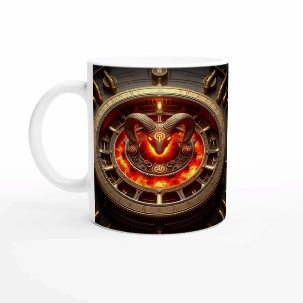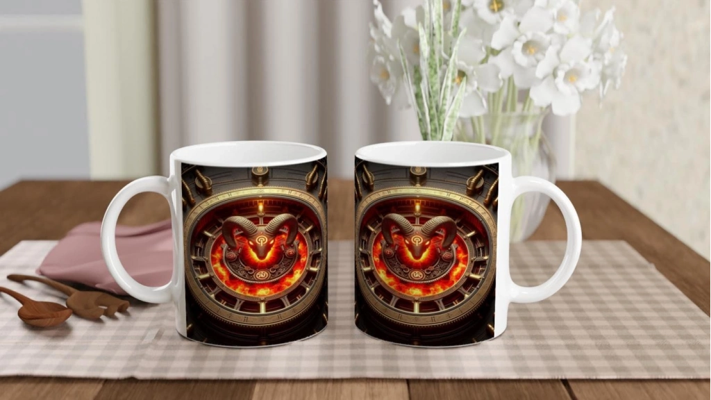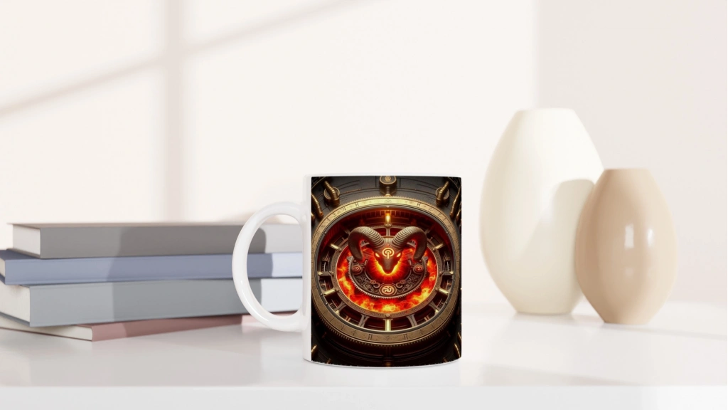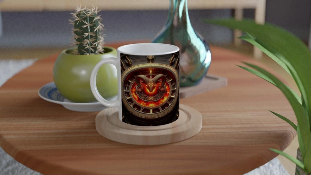 Koç burcunun enerjisini, astrolojik çarkların hareketiyle birleştiren bu tasarım; kahvenize hem motivasyon hem de stil katıyor.