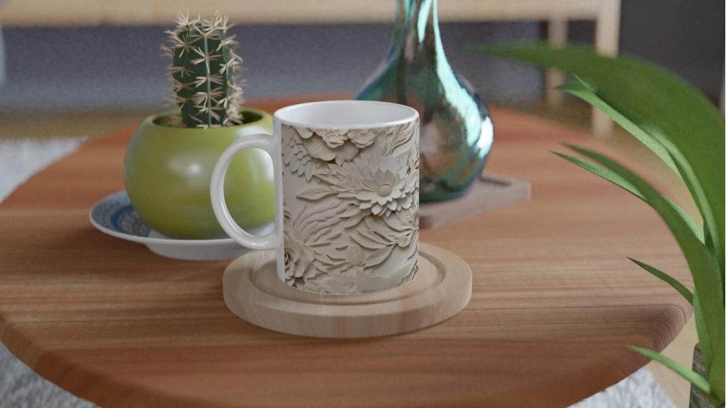Kabartmalı çiçek yaprakları ve yoğun detaylarla bezeli bu kupa bardak, estetik ve romantik bir hava taşır.