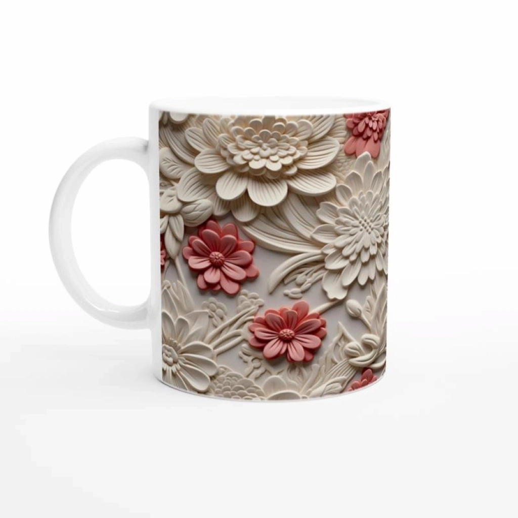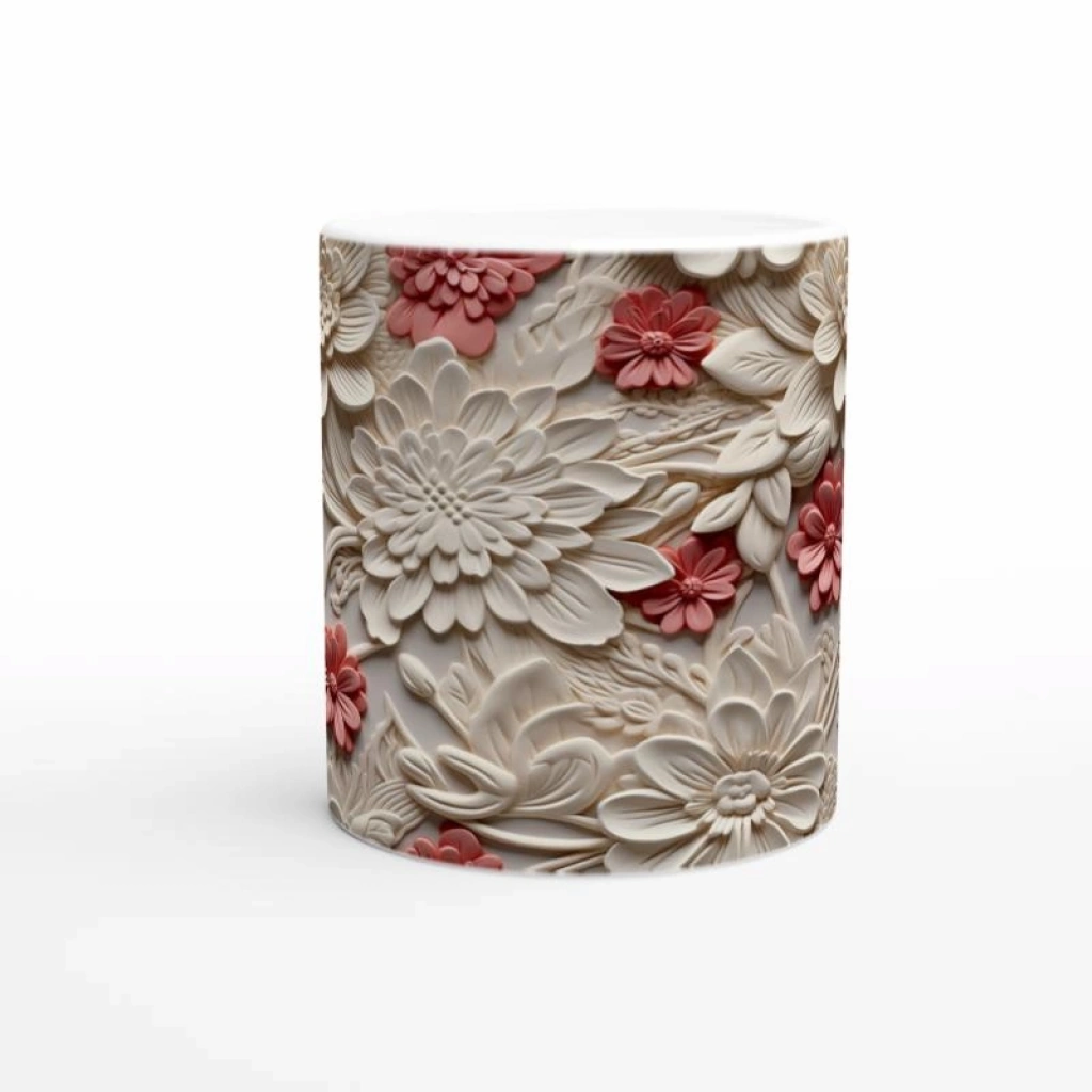Farklı boyutlardaki kabartmalı çiçek detayları sayesinde derinlik hissi veren bu özel tasarım kupa bardak, hem şık sunumlar hem de estetik hediye seçenekleri için ideal bir parça.