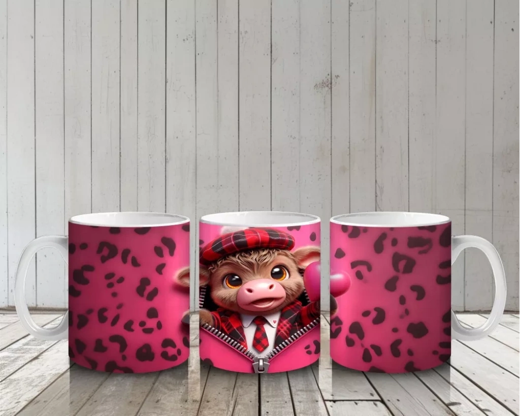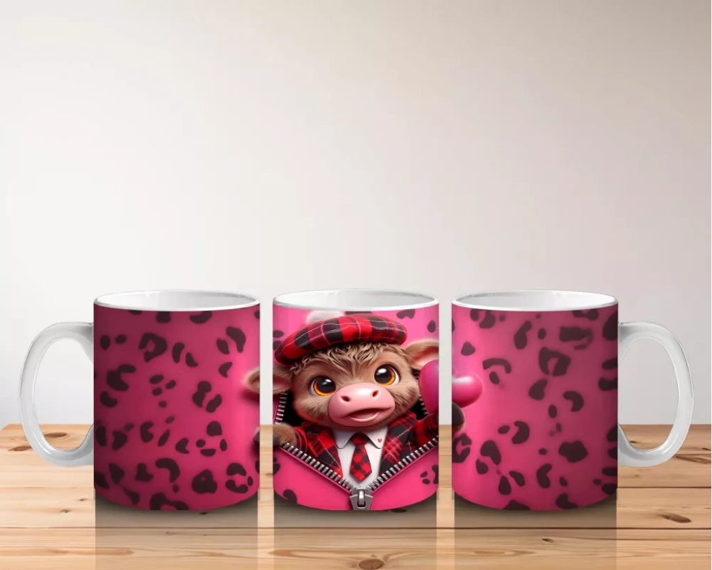 Leopar desenli kalpler arasında duran tatlı buzağı, neşeli ve samimi bir görünüm sunuyor. Romantik ve pozitif detayları sevenler için ideal bir tasarım.