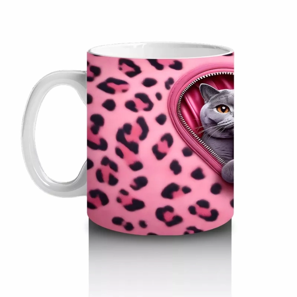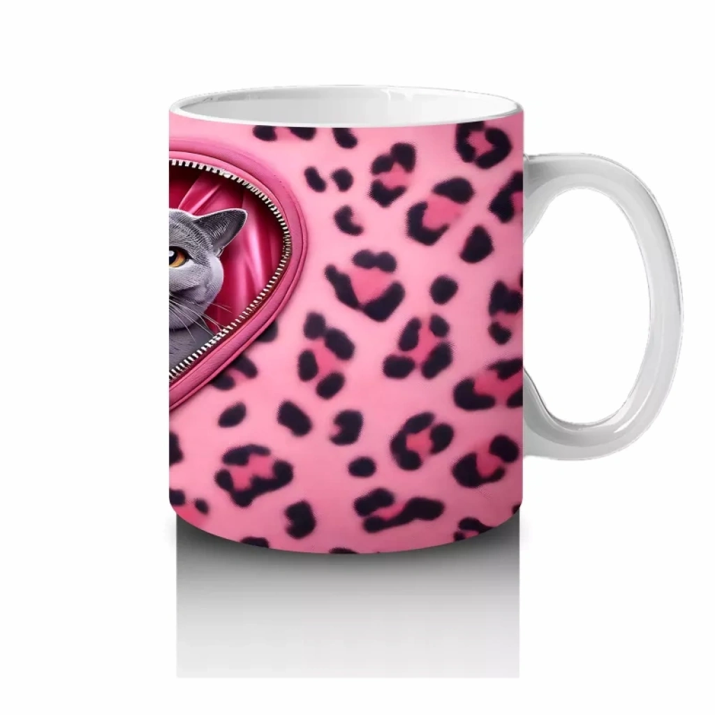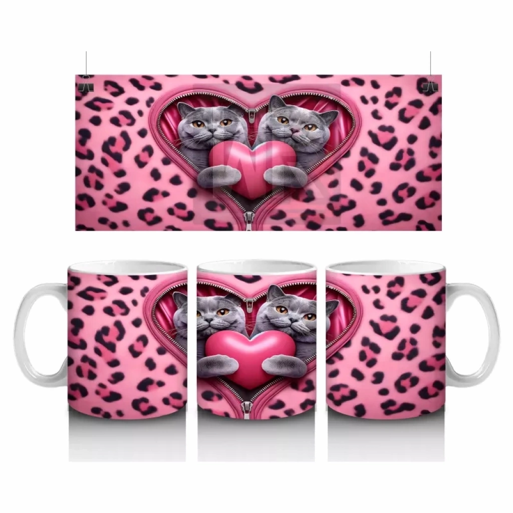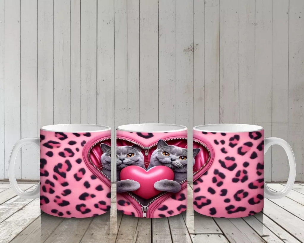 Leopar desenli kalplerle çevrili kedi çifti, aşkı hem stil hem de sevimlilikle anlatıyor. Sıra dışı ve estetik bir tasarım arayanlar için özgün bir kupa seçeneği.