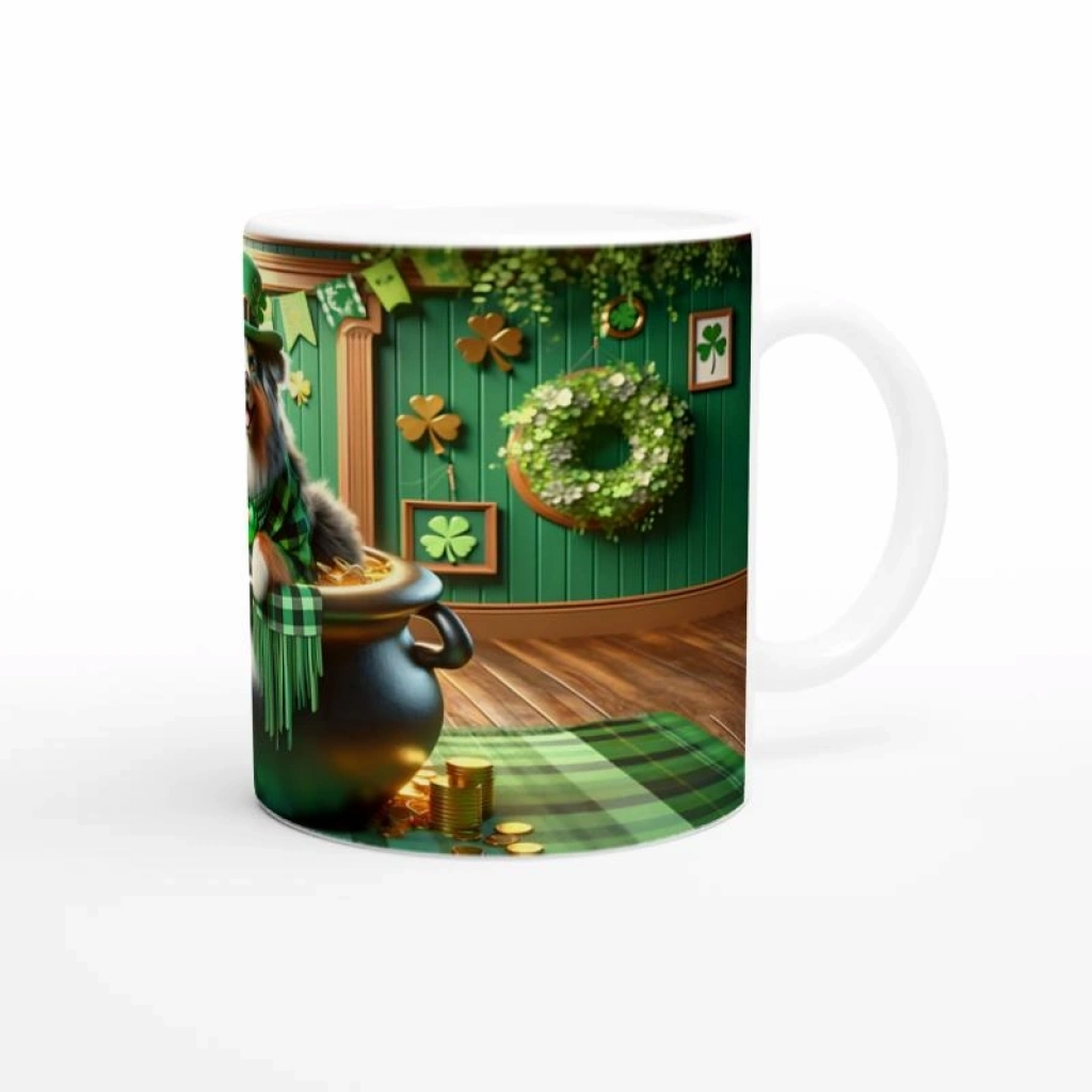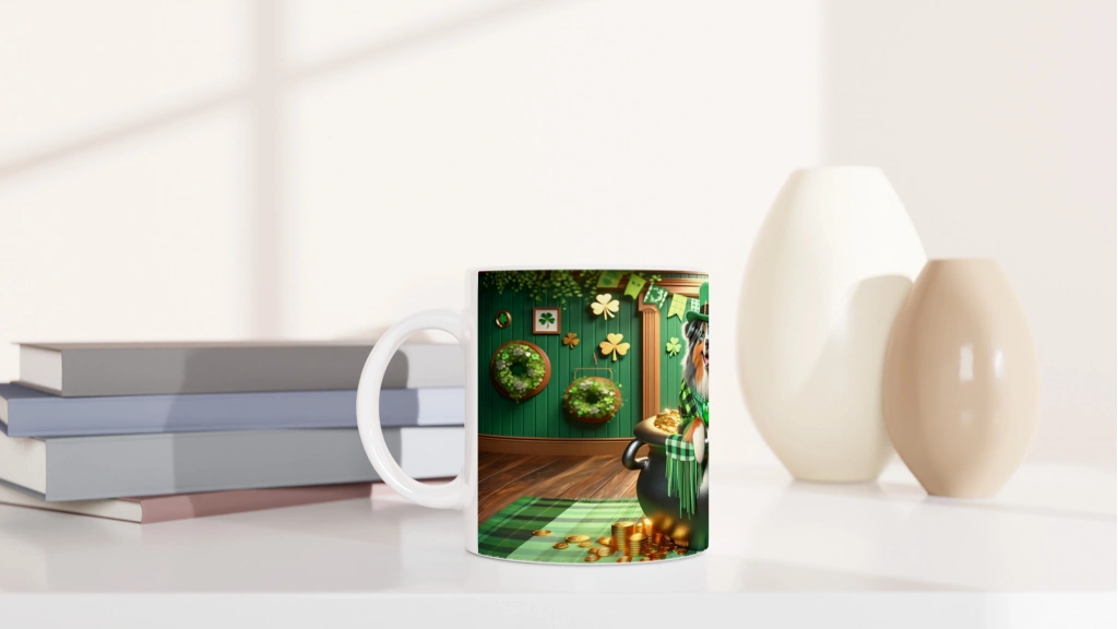Leprechaun Şapkalı Avustralya Çoban Köpeği Temalı Baskılı Kupa Bardak, parlak yeşil detaylar, samimi bir gülümseme ve St. Patrick’s Day ruhuyla harmanlanmış sahnesiyle pozitif hisler uyandırıyor. Hem köpekseverler hem de tematik koleksiyoncular için harika bir tercih.
