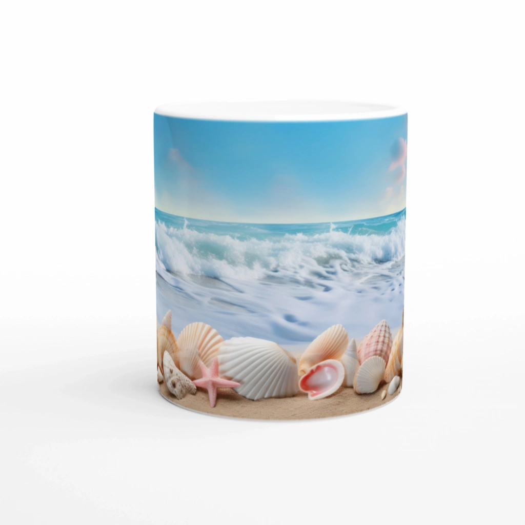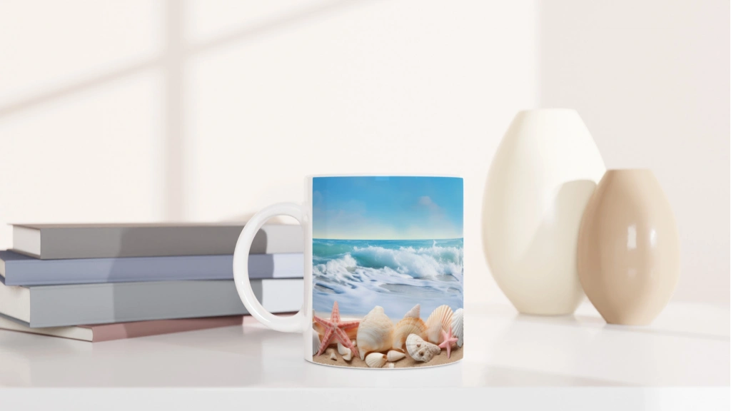 Geniş ufuklu deniz manzarası ve doğal kabuk detaylarıyla tasarlanan bu kupa bardak, yazın huzurunu yudumlamanıza eşlik eder.