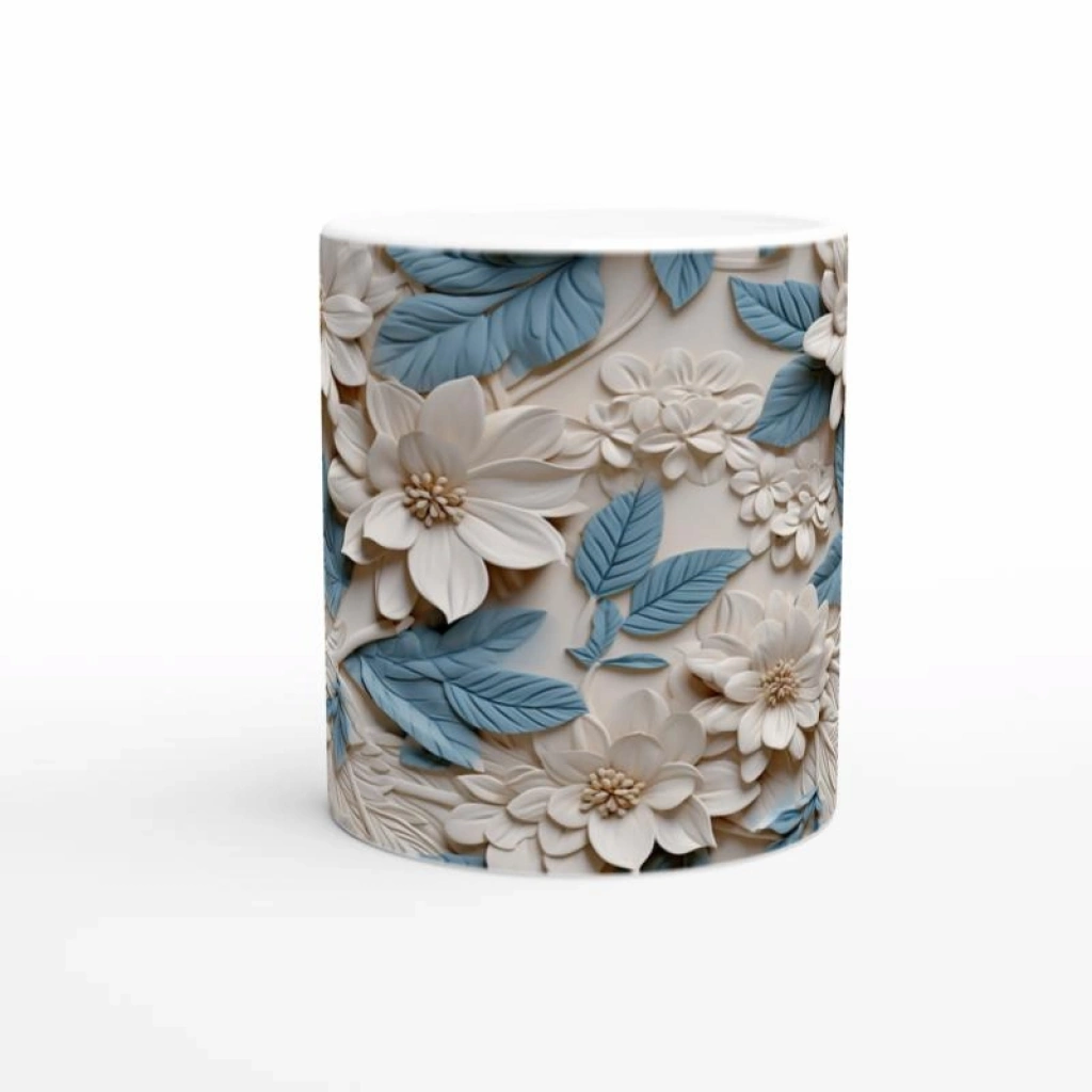 Pastel mavi yapraklarla süslenmiş zarif çiçek desenleri, bu kupa bardağı sadelik ve doğallığın simgesi haline getiriyor.