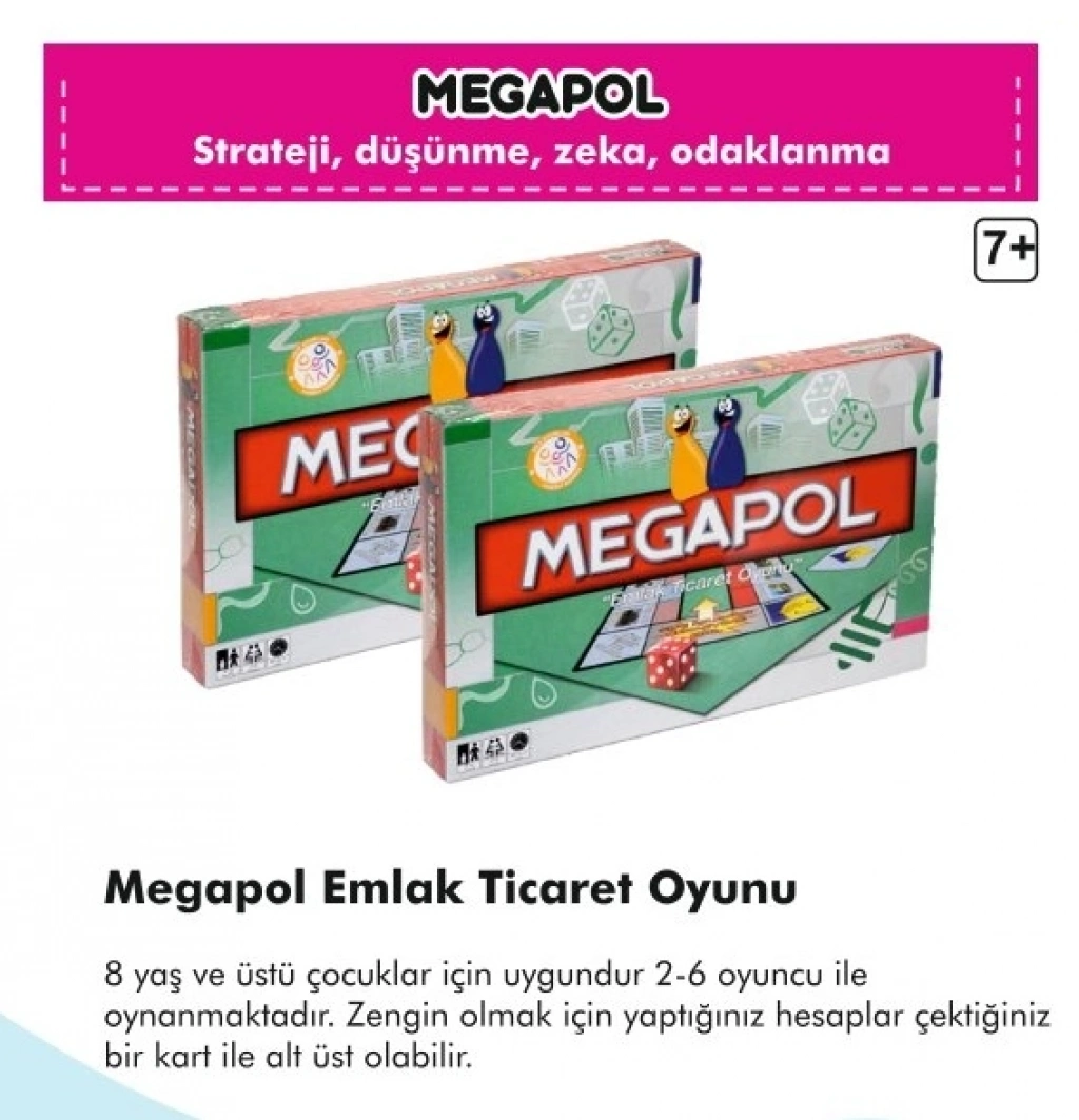 Megapol, klasik ticaret oyunlarını sevenler için modern ve eğlenceli bir alternatiftir. Oyuncuların finansal okuryazarlık temellerini eğlenerek öğrenmelerini sağlar, hızlı karar verme ve planlama yeteneklerini geliştirir. Kaliteli materyalleri ve zengin kutu içeriği ile uzun yıllar keyifle oynanacak bir settir.