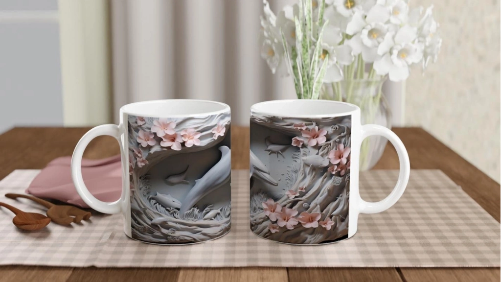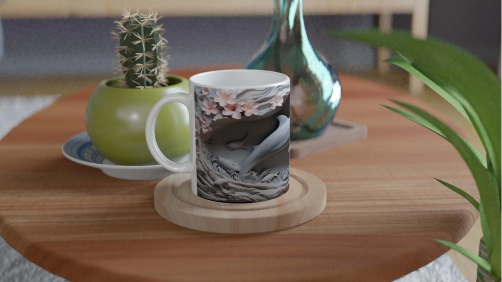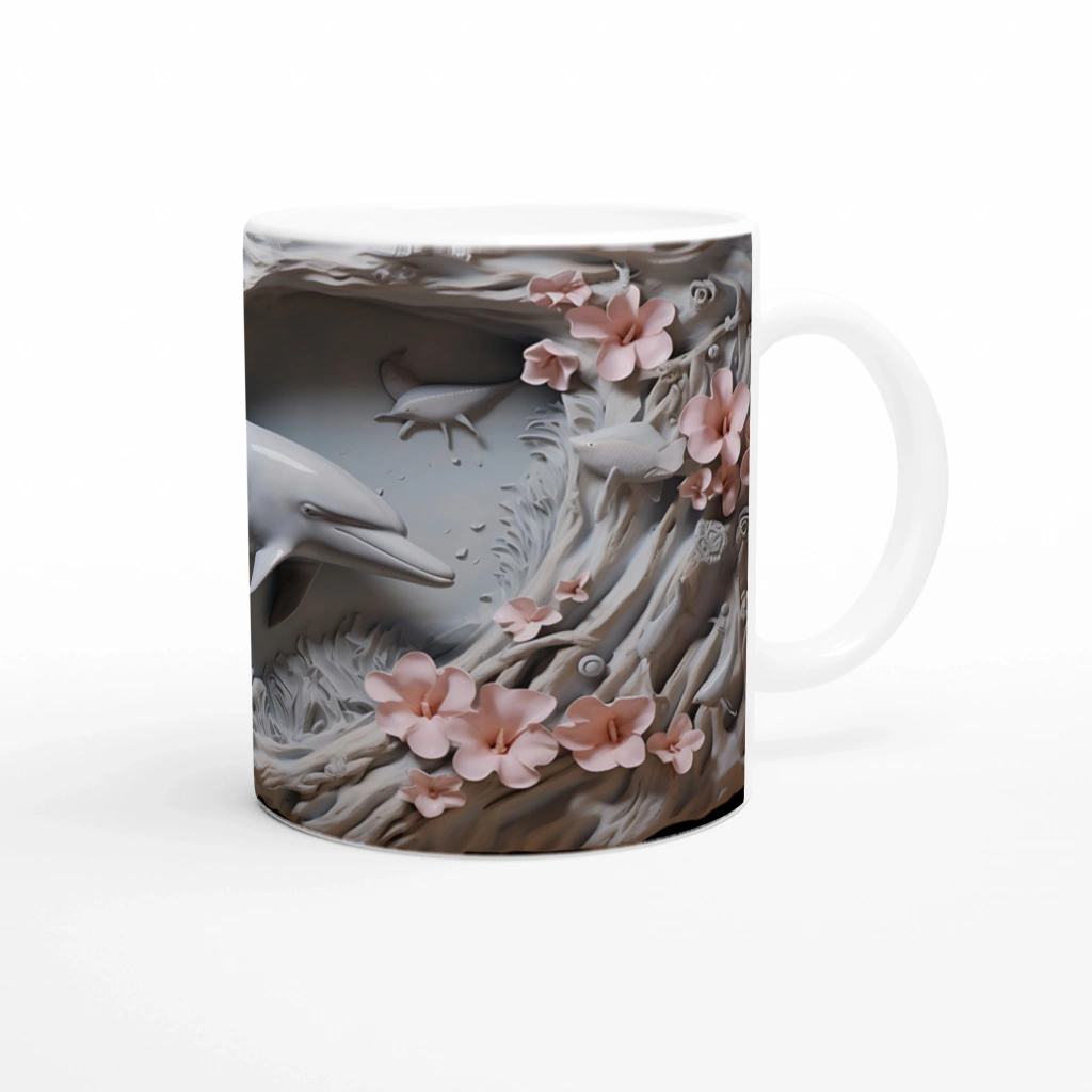 Sanatsal detaylarla zenginleşen bu yunus desenli kupa bardak, doğanın zarafetini ve okyanusun büyüsünü bir arada sunuyor.