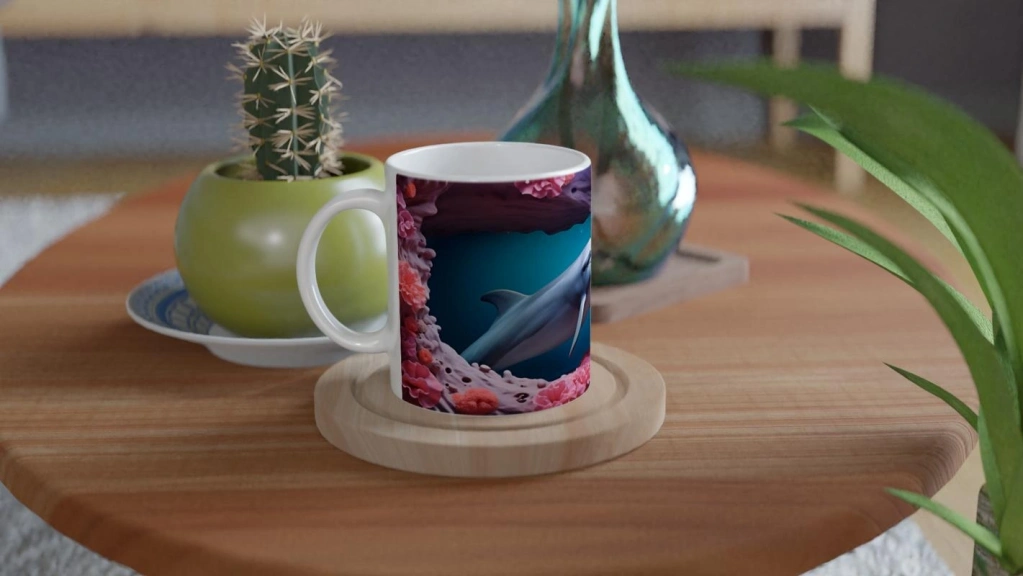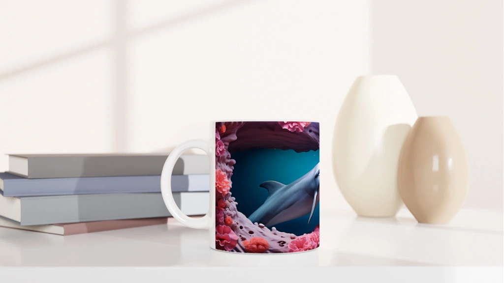 Sevimli yunus ve renkli mercan detaylarıyla bezeli bu su altı temalı kupa bardak, her yudumda okyanusun enerjisini yansıtıyor.