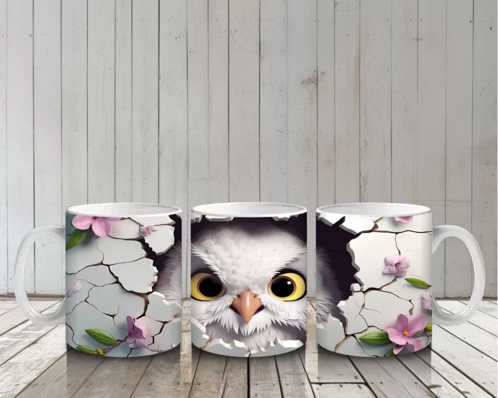 Mor çiçeklerin arasında dikkatle bakan sarı gözlü baykuş, bilgelik ve sakinliği yansıtan zarif bir tasarım oluşturuyor. Gece ve doğa temalı hediyeler için anlamlı bir kupa seçeneği.