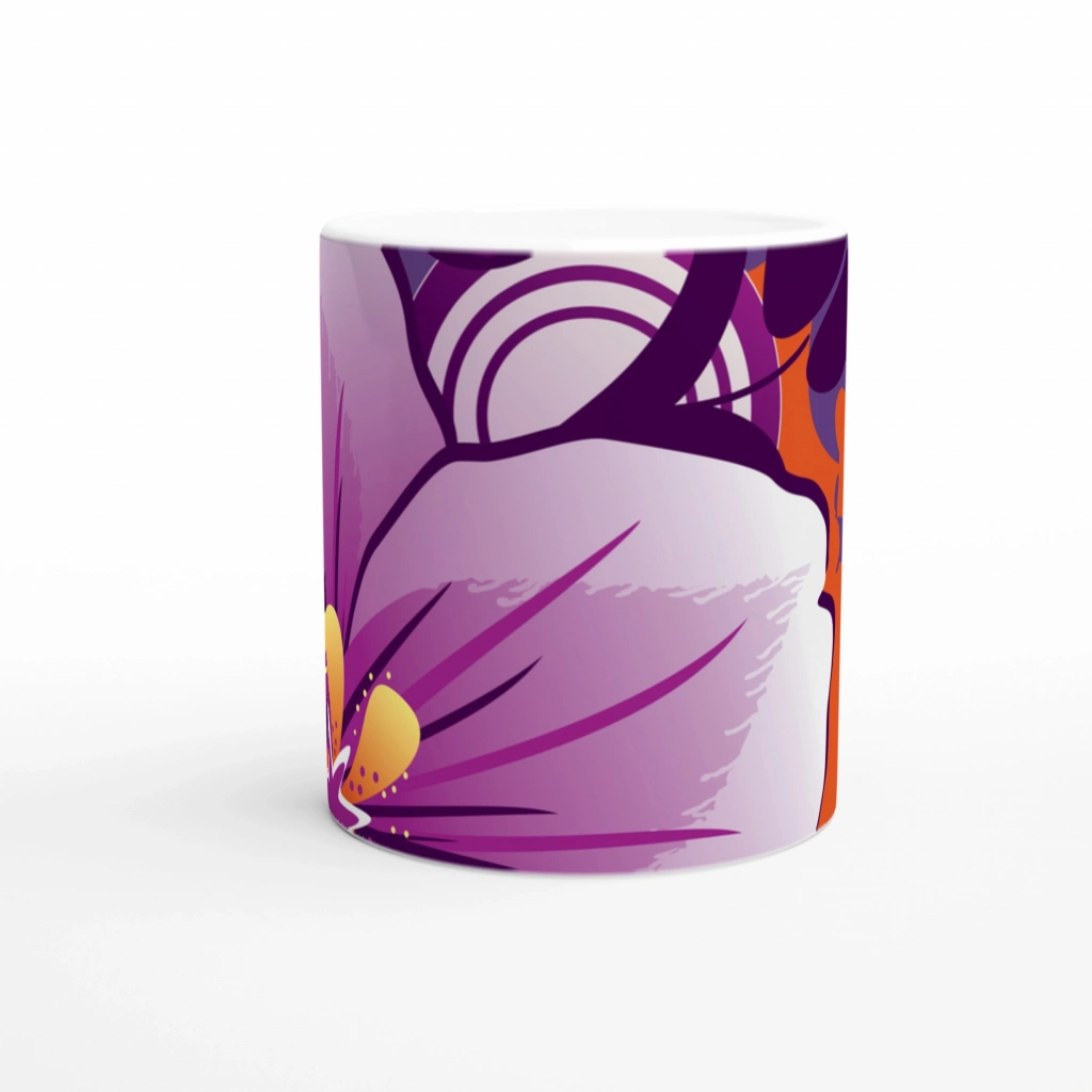 Mor & Turuncu Soyut Çiçek Desenli Kupa Bardak, yoğun mor, turuncu ve lila tonlarıyla dikkat çekici bir görsellik sunuyor.