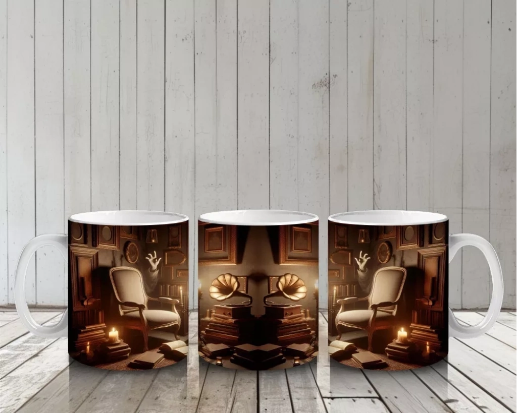 Mum ışığı ve kitaplarla süslenmiş gotik cadı masası temalı bu kupa bardak, Cadılar Bayramı’na mistik ve etkileyici bir hava katar.