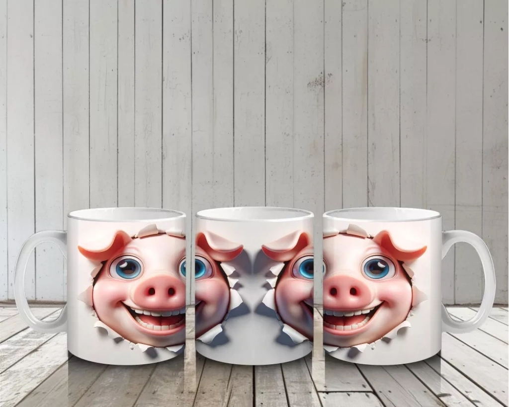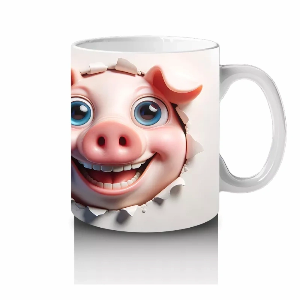 Mutlu İfade ile Bakan Çift Domuz Karakteri – Baskılı Kahve Kupası
