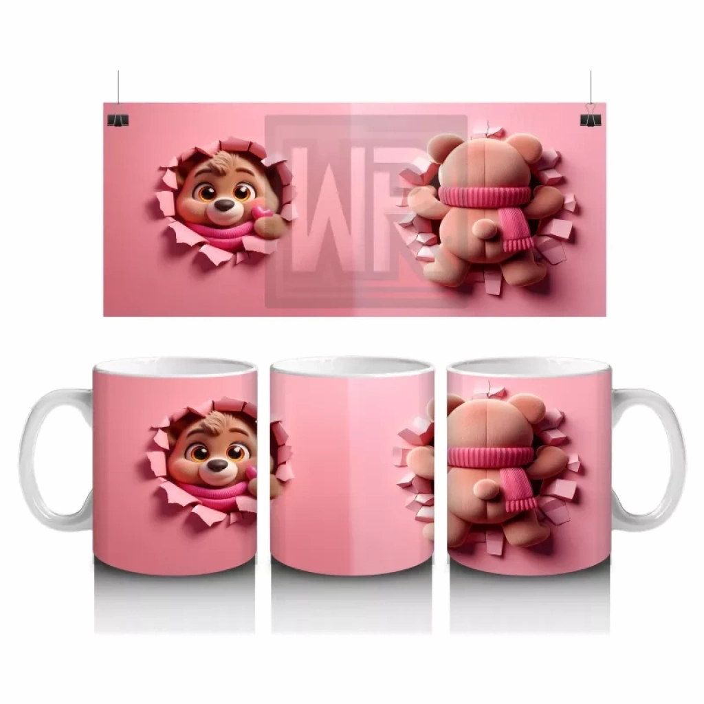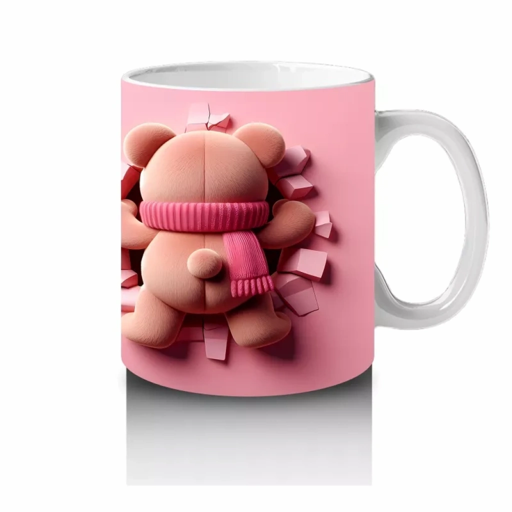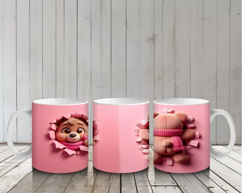 Ön ve Arka Görünümle Sevimli Pembe Bereli Köpek Figürü – Baskılı Kahve Kupası