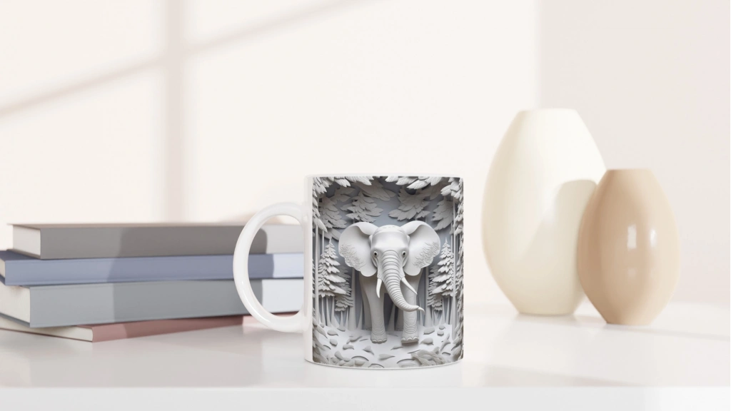 Ormanda Beliren Fil Silueti Temalı Baskılı Kupa Bardak, beyaz tonlarda hazırlanmış orman fonu ve göz alıcı fil figürüyle minimalist estetiği ve vahşi doğanın gücünü bir araya getiriyor.