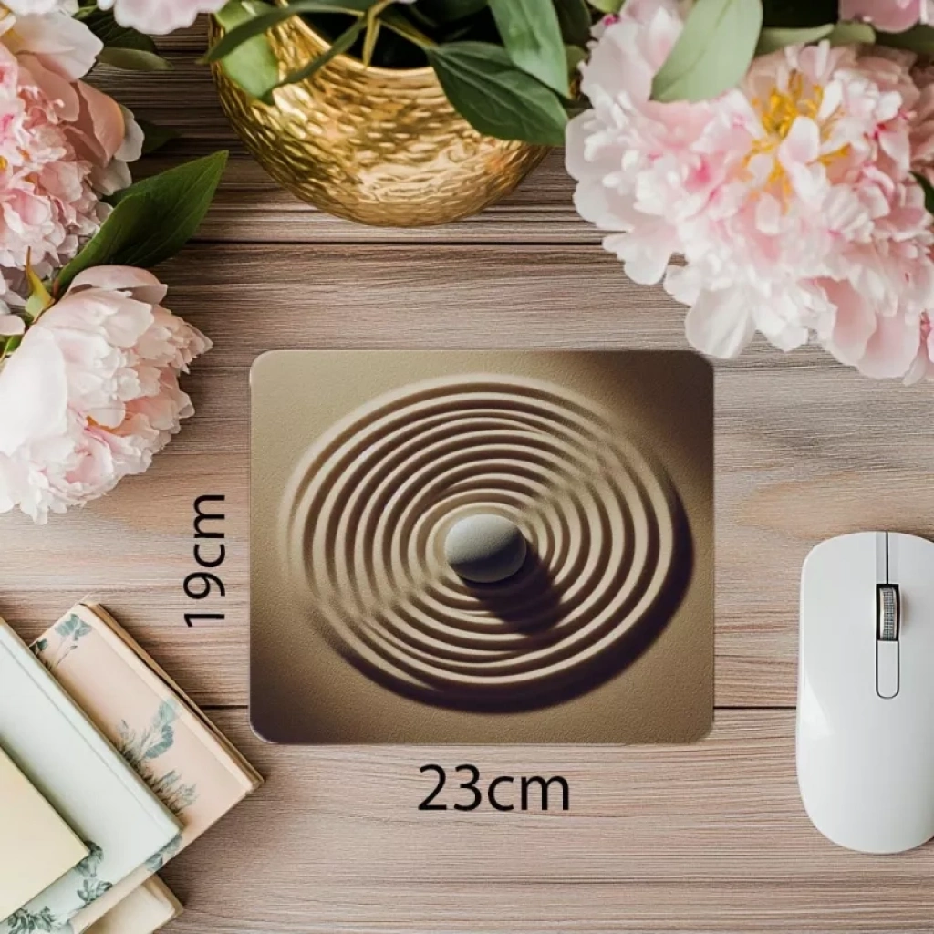 Ortada konumlandırılmış tek taş ve spiral kum desenleriyle bu zen temalı mousepad, denge ve odaklanma arayanlar için ideal bir tercihtir.