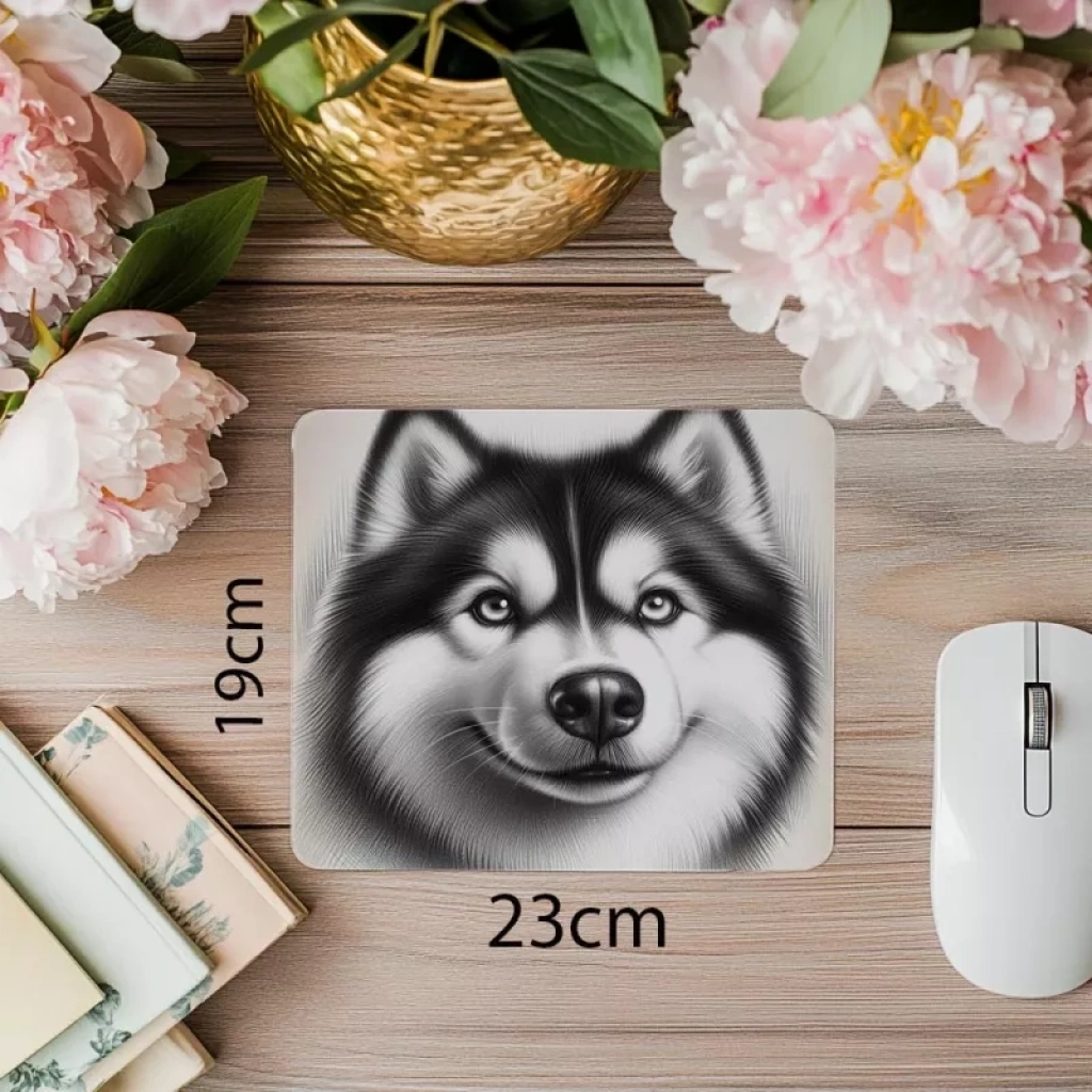 Parlak gözlü kurt köpeği tasarımlı mouse pad, yüksek hassasiyetli yüzeyi ve dayanıklı kaymaz tabanıyla modern bir dokunuş katar.