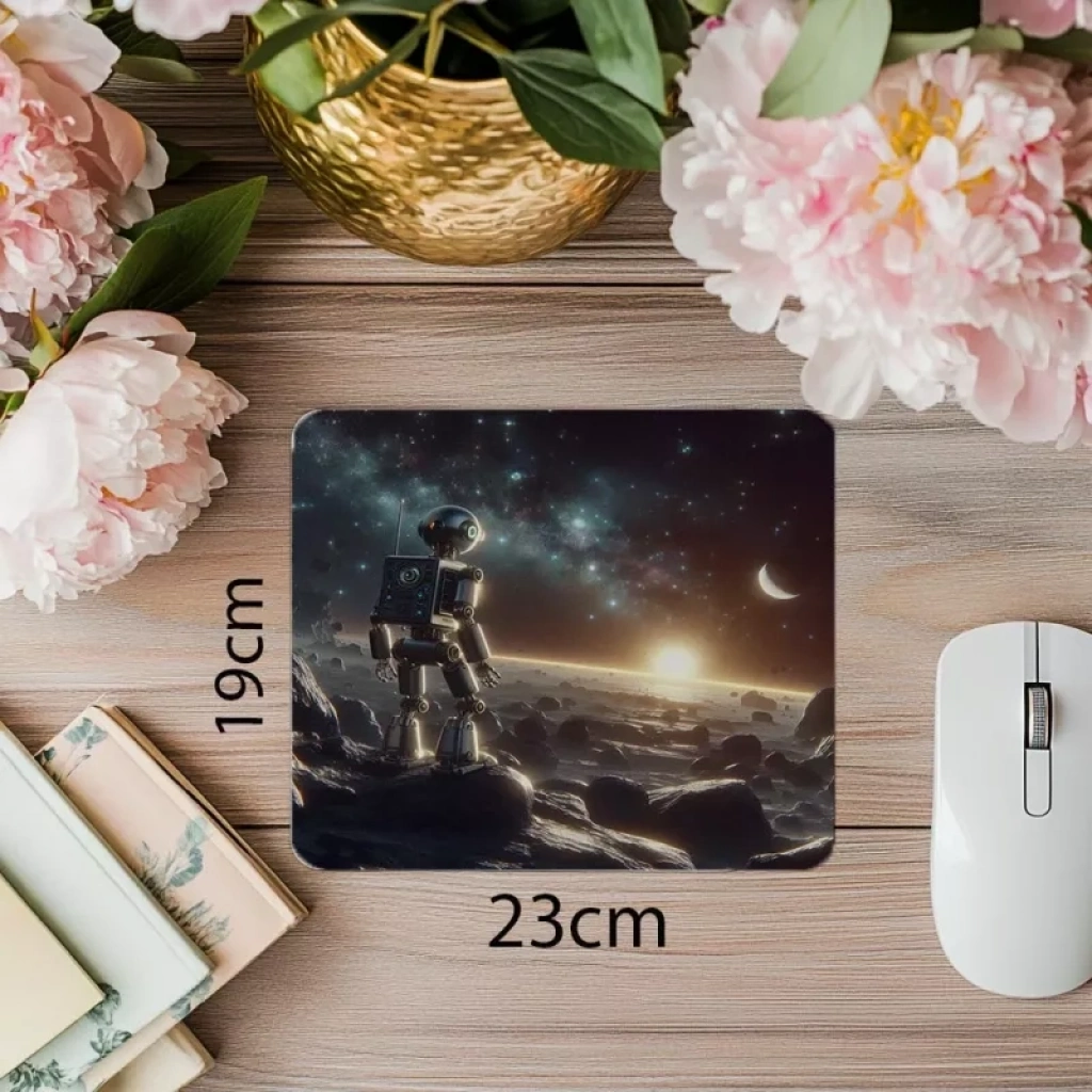 Fütüristik parıltıya sahip metalik robot figürüyle teknoloji ve tasarımı bir araya getiren çarpıcı mousepad!