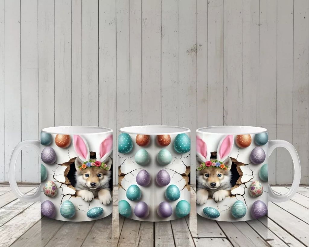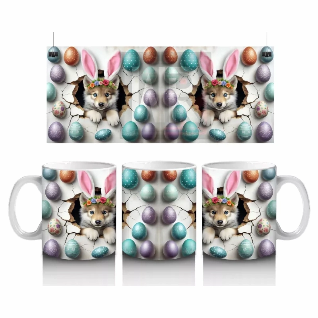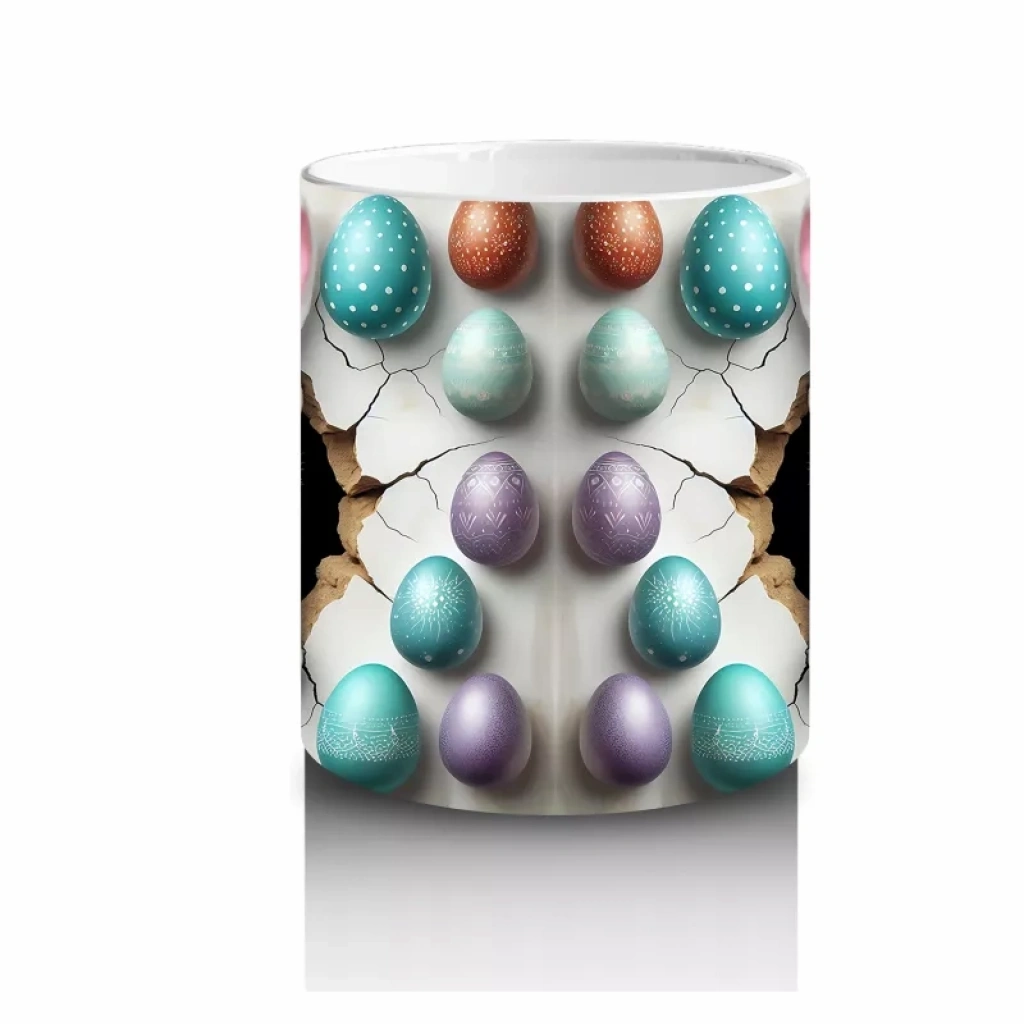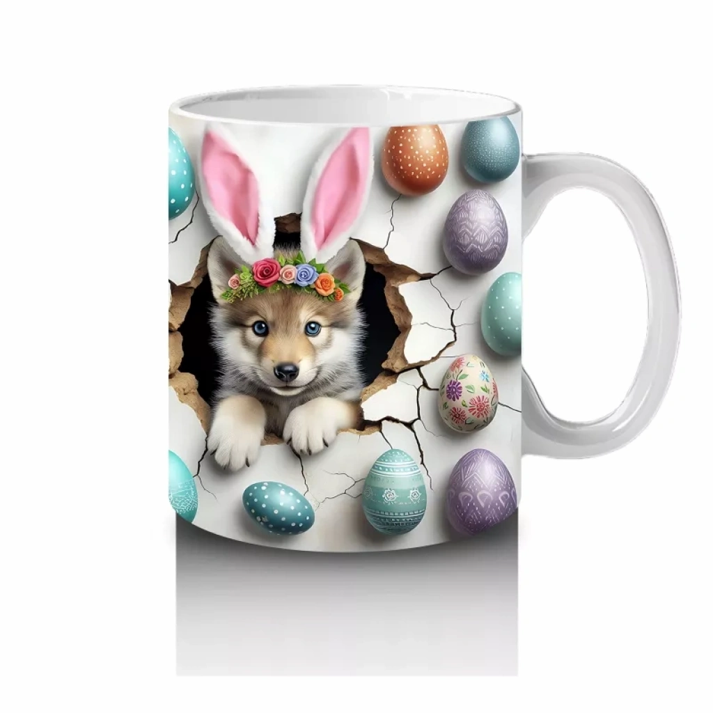 Renkli paskalya yumurtaları arasında neşeyle duran sevimli tavşanlar, baharın ve kutlamanın enerjisini yansıtıyor. Canlı ve pozitif tasarımlar arayanlar için ideal bir kupa.