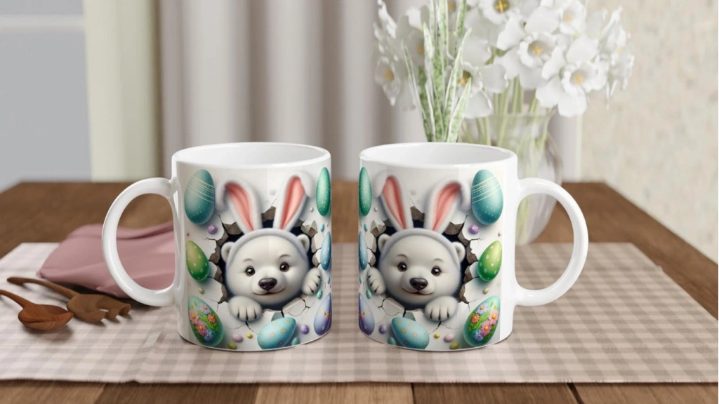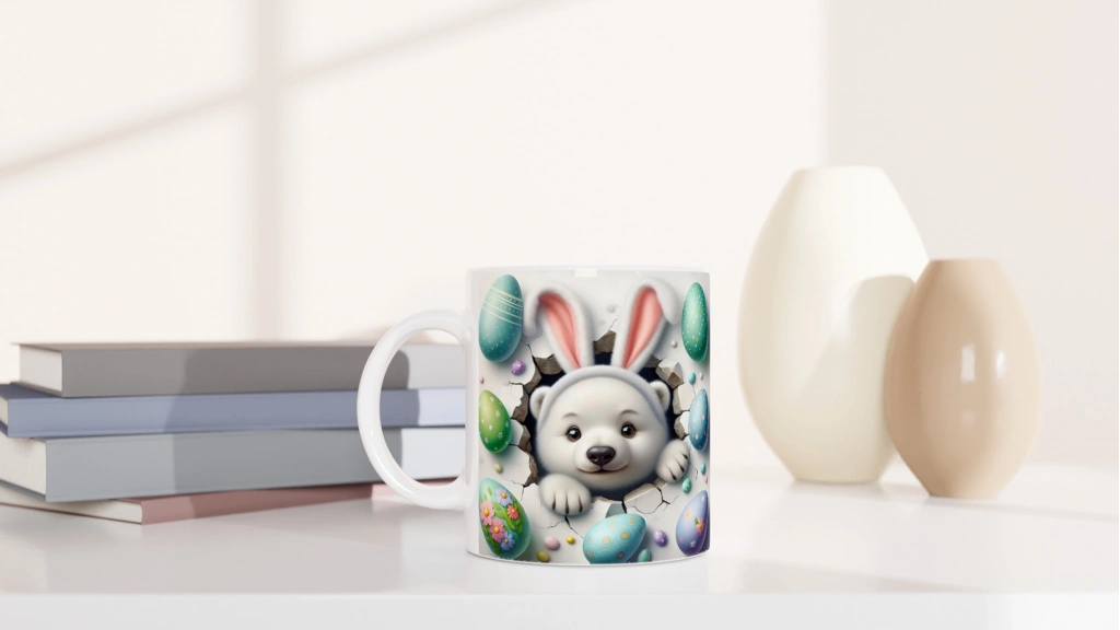 Paskalya Yumurtaları Arasında Tavşan Kulaklı Ayı Temalı Baskılı Kupa Bardak, kırık duvar deseninden sevimlice bakan ayıcık ve etrafındaki süslü yumurtalarla çocuklara ve içindeki çocuğu yaşatanlara hitap ediyor. Neşeli ve yumuşak tasarımıyla özel günlerde hediye olarak öne çıkıyor.