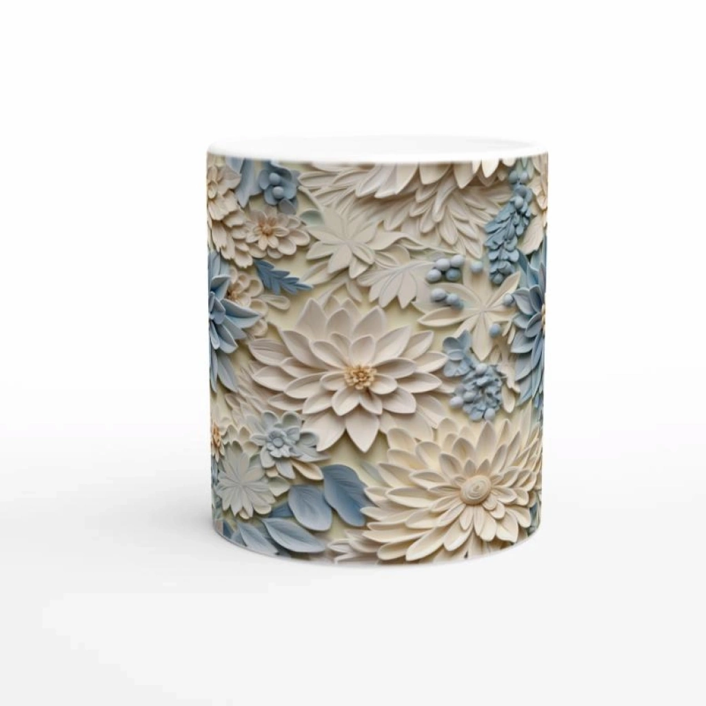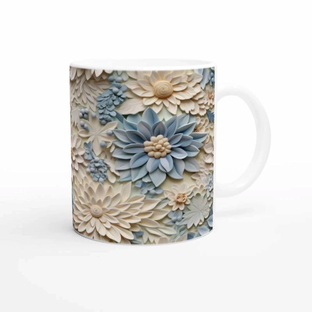 Yumuşak krem ve pastel mavi tonlarındaki büyük çiçek motifleriyle süslenen bu kupa bardak, baharın tazeliğini ve huzurunu yudumlarınıza taşıyor. Üç boyutlu yapısıyla zarif ve sofistike bir görünüm sunum
